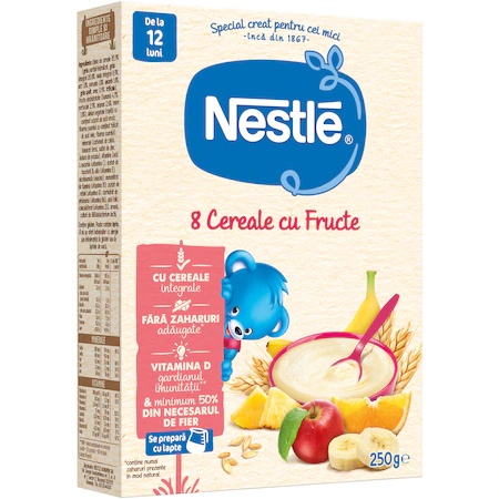 8 cereale cu fructe 12-36l, 250g, Nestle Fara zaharuri adaugate; Fara conservanti si coloranti adaugati; Vitamine si minerale pentru o dezvoltare armonioasa; Fier, iod, Vitamina B3 pentru sistemul nervos si o dezvoltare cognitiva normala; Vitaminele A, C, D si Zinc contribuie la dezvoltarea normala a sistemului imunitar. Ofera-i puiului tau o masa delicioasa pe baza de cereale (grau, porumb, secara, orz, grau spelt, triticale, orez, ovaz integral) si fructe (banane, portocale, ananas, mere) imbogatite cu nutrienti esentiali. Cerealele Nestlé® 8 Cereale cu fructe sunt usor de preparat si datorita aportului lor nutritional, gustului delicat si texturii moi sunt adecvate pentru perioada de diversificare. Fiecare portie de cereale Nestlé pentru copii de varsta mica este special creata pentru puiul tau, asigurandu-i nutrienti esentiali pentru o crestere si dezvoltare normala intr-o portie potrivita stomacului sau mic. Cerealele speciale pentru copii de varsta mica contin Fier, Iod si Vitamina B1 pentru sistemul nervos si o dezvoltare cognitiva normala. Puiul tau are nevoie de 5 ori mai mult Fier, per kg corp, decat un adult* iar o portie pe zi de cereale Nestlé® pentru copii de varsta mica asigura cel putin 50% din necesarul lui**. In plus, acestea contin imunonutrienti precum Vitaminele A, C si D si Zinc, care ajuta la functionarea normala a sistemului imunitar. Cerealele Nestlé® pentru copii de varsta mica sunt si o sursa de Calciu, care contribuie la cresterea si dezvoltarea normala a oaselor la copii. * Conform cerintelor nutritionale per kg de greutate corporala – WHO/FAO Vitamin and Mineral Requirements in Human Nutrition: Report of a Joint FAO/WHO Expert Consultation. Second edition. WHO/FAO. 2004. ** Din Valoarea Nutritionala de Referinta. Instructiuni de preparare: Spala-te pe maini inainte de a pregati mancarea copilului si asigura-te ca vesela este curata. Chiar inainte de a prepara cerealele, recolteaza lapte de mama conform indicatiilor medicului dumneavoastra sau prepara laptele continuare conform indicatiilor de pe ambalajul cutiei de lapte praf; Masoara 160 ml de lapte de mama sau lapte de continuare si toarna in castronasul copilului. Ai grija ca temperatura laptelui sa nu depaseasca 40°C; Adauga 25 g sau 5 linguri rase de pudra de cereale; Amesteca pana la obtinerea unei compozitii omogene. Nu uita ca intotdeauna sa hranesti sugarul cu o lingurita curata. Nu pastra portia neterminata. Ingrediente: faina de cereale 84,6% (grau partial hidrolizat, grau integral 20,5%, ovaz integral 8,8%, orz 1,7%, porumb 1,7%, secara 1,7%, grau spelt, orez 0,9%, triticale), fructe deshidratate (banana 4,7%, portocale 2,9%, ananas 2,6%, mere 1,8%), uleiuri vegetale (rapita cu continut scazut de acid erucic, floarea soarelui cu continut ridicat de acid oleic, floarea soarelui), minerale (carbonat de calciu, fumarat feros, sulfat de zinc, iodura de potasiu), vitamine [acid L-ascorbic (vitamina C), acetat de tocoferil DL-alfa (vitamina E), nicotinamida (niacina), mononitrat de tiamina (vitamina B1), acetat de retinil (vitamina A), clorhidrat de piridoxina (vitamina B6), acid folic, colecalciferol (vitamina D)], aroma, culturi de Bifidobacterium lactis. Alergeni: Contine gluten. Poate contine lapte. A nu se oferi bebelusilor cu alergie sau intoleranta la laptele de vaca. Valori energetice (100 g/ml): Energie kJ: 1606 g; Energie kcal: 384 g; Grasimi: 3 g; Din care acizi grasi saturati: 0.3 g; Carbohidrati: 76.2 g; Din care zahar: 22 g; Fibre: 6 g; Proteine: 10 g; Sare: Organizatia Mondiala a Sanatatii recomanda alaptarea exclusiva pana la 6 luni si inceperea diversificarii dupa aceasta varsta, in paralel cu alaptarea. Este important ca cel mic sa beneficieze de o alimentatie variata si echilibrata, ca un prim pas pentru un stil de viata sanatos. Intreaba medicul cu privire la introducerea in alimentatia sugarului si a altor alimente, in completarea laptelui de mama sau a formulei de lapte. Se recomanda continuarea alaptarii pe o perioada cat ma indelungata dupa inceperea diversificarii alimentatiei. Mod de pastrare: A se pastra la loc uscat si racoros. Inchideti cutia dupa fiecare utilizare si depozitati-o la loc uscat si racoros. Folositi in maxim o luna de la deschidere. 1 portie = 25 g produs (5 linguri) + 160 ml lapte. Contine 10 portii. Prezentare: 250g