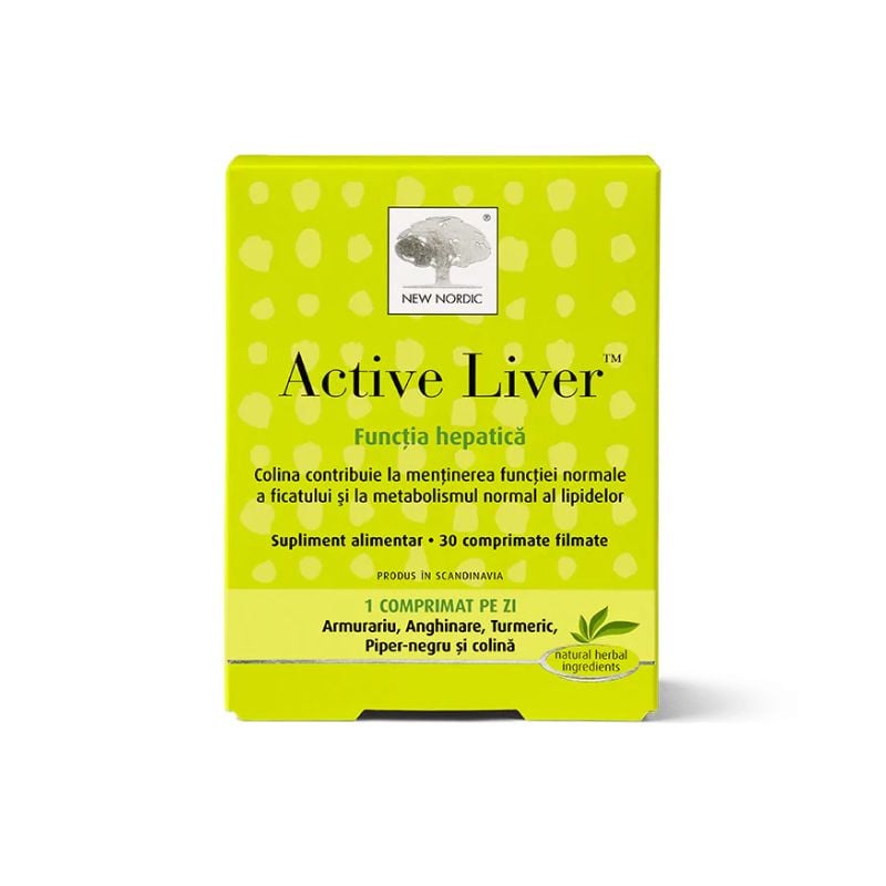 Active Liver™ este produs in Scandinavia. Comprimatele sunt o asociere de extracte din plante – Armurariu, Anghinare, Turmeric si Piper-negru, plus nutrientul esential colina. Armurariul si Anghinarea sustin functia normala a ficatului. Colina contribuie la mentinerea functiei normale a ficatului si la metabolismul normal al lipidelor. Efectul benefic se obtine in urma consumului a cel putin 82,5 mg de colina la 100 g sau 100 ml sau la o singura portie de produs alimentar.