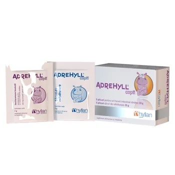 Este un produs care vine in intampinarea utilizatorului prin forma de prezentare ce contine Saccharomyces boulardii si saruri de rehidratare, in aceeasi cutie. Beneficii: Saccharomyces boulardii ajuta la refacerea florei intestinale afectata de diareea acuta infectioasa si la normalizarea scaunelor. Este o drojdie rezistenta la actiunea sucurilor gastrice si intestinale, a antibioticelor si a sulfamidelor. Ajuta la normalizarea tranzitului intestinal si la biosinteza vitaminelor din grupul B: B1, B2, B3, B5 si B6. Saruri de rehidratare: Prin continutul sarurilor de sodiu, potasiu si acid citric, AdreHyll copii contribuie la corectarea starilor de deshidratare si a dezechilibrului electrolitic. Gustul sarurilor de rehidratare este placut si nu pune probleme de utilizare la copii. Produsul nu contine conservanti si coloranti. Ingrediente plic antidiareic: 2,5 miliarde culturi viabile Saccharomyces boulardi. Ingrediente plic saruri de rehidratare : clorura de sodiu, citrat de sodiu, clorura de potasiu și acid citric. Mod de utilizare: Plic antidiareic: 1 – 2 plicuri pe zi (sau conform sfatului specialistului), intr-un pahar cu ceai sau apa calduta. Plic saruri de rehidratare: 1 – 2 plicuri pe zi (sau conform sfatului specialistului), in 250 – 500ml (in functie de greutatea copilului) de ceai sau apa calduta. Solutia obtinuta prin dizolvarea plicurilor de saruri de rehidratare se utilizeaza pe parcursul a 4 ore. Sarurile de rehidratare se utilizeaza la 2 ore de la ingestia plicului antidiareic. Recomandari: Diaree asociata tratamentului cu antibiotice; Diaree de etiologie necunoscuta; Diaree de cauza infectioasa.