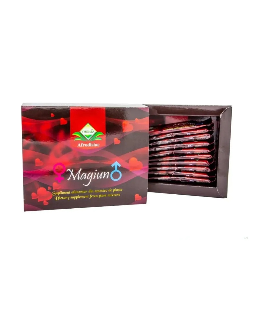 Afrodisiac Natural Magiun 12g, 12plicuri, Themra Magiun Afrodisiac Themra, 12 plicuri este un supliment alimentar 100% natural, destinat adulților, realizat dintr-o combinație de miere și extracte din plante atent selecționate. Produsul este conceput pentru a susține nivelul de energie, vitalitatea și starea generală de bine, contribuind la menținerea unui stil de viață activ. Produsul poate: contribui la susținerea libidoului; sprijini nivelul de energie și rezistență fizică; susține circulația sanguină și metabolismul; contribui la starea generală de bine fizică și mentală. Mod de administrare Se recomandă 1 plic pe zi, preferabil cu 30–40 de minute înainte de activitate fizică sau intimă. Se poate consuma simplu sau amestecat cu lichide. A nu se depăși 1 porție la 24 de ore. Nu se recomandă copiilor, femeilor însărcinate sau care alăptează și persoanelor cu afecțiuni medicale fără aviz medical.
