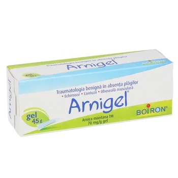 Arnigel 70mg/g, 45g, Boiron Arnigel este un medicament homeopatic utilizat in mod traditional in tratamentul local al traumatologiei benigne in absenta plagilor (echimoze, contuzii, oboseala musculara) la adulti si copii cu varsta de peste 1 an. Mod de utilizare: Utilizati intotdeauna acest medicament exact asa cum este descris in acest prospect sau asa cum v-a spus medicul sau farmacistul. Discutati cu medicul dumneavoastra sau cu farmacistul daca nu sunteti sigur. Doze: Aplicati cat mai repede posibil un strat fin de ARNIGEL pe zona cutanata corespunzatoare regiunii dureroase masand usor pana la penetrarea completa. Se repeta aplicarea o data sau de doua ori pe zi. Mod de administrare: administrare cutanata. Daca utilizati mai mult ARNIGEL decat trebuie adresati-va medicului dumneavoastra sau farmacistului. Daca uitati sa utilizati ARNIGEL nu utilizati o doza dubla pentru a compensa doza uitata. Daca aveti orice intrebari suplimentare cu privire la acest medicament, adresati-va medicului dumneavoastra sau farmacistului. Reactii adverse posibile: Ca toate medicamentele, acest medicament poate provoca reactii adverse, cu toate ca nu apar la toate persoanele. Exista un risc de aparitie a dermatozei pentru persoanele sensibile la Arnica montana. In cazul aparitiei reactiilor alergice, se opreste tratamentul. Deoarece produsul contine alcool, aplicatiile cutanate frecvente pot provoca iritatii si uscaciunea pielii. Prezentare: tub cu 45g gel