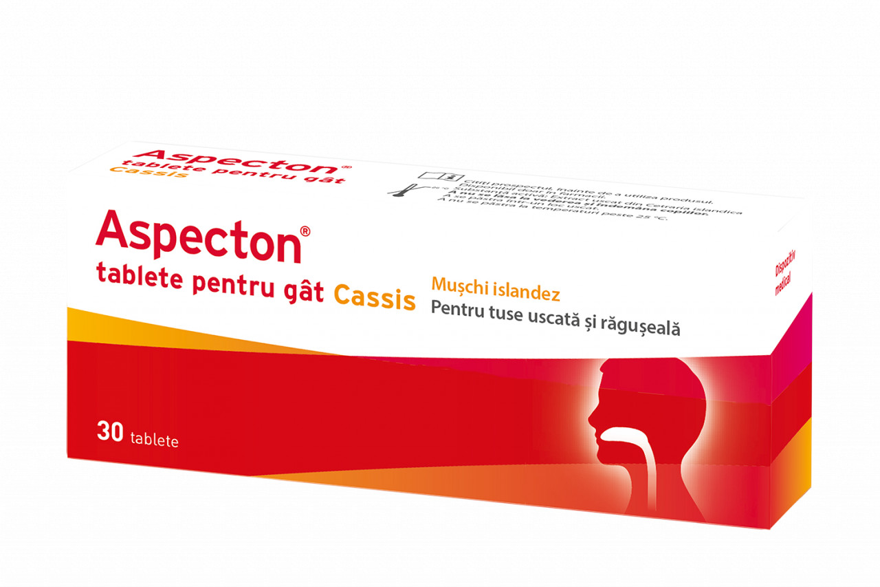 Tablete pentru gat Aspecton Cassis, 30 tablete, Krewel Meuselbach Atenueaza in mod evident tusea uscata si raguseala. Proprietati: – amelioreaza imediat tusea iritativa si calmeaza mucoasa uscata a cailor respiratorii; – atenueaza tusea fara a o bloca; – formeaza o pelicula protectoare pe mucoasa cavitatii bucale si faringiene; – bine tolerate; – pot fi combinate cu expectorante sau alte medicamente pentru raceala. Caracteristici: – contine vitamina C; – efectul calmant se datoreaza proportiei ridicate de substante mucilaginoase continute in extractul uscat de muschi islandez – ajuta la regenerarea mucoasei; – fara zahar; – aroma placuta de coacaze negre; – ideal de folosit in calatorii. Ingrediente: 1 tableta contine 20 mg extract uscat de Cetraria islandica. Alte ingrediente – sorbitol, hipromeloza, aroma de coacaze negre, acid ascorbic (vitamina C), guma xantan, pantotenat de calciu, acid citric (anhidru), polietilen glicol 6000, stearat de magneziu (din plante), ciclamat de sodiu, talc, dioxid de titan (E171), oxid de fier (E172), zaharina sodica. Mod de utilizare: Se lasa sa se dizolve 1 tableta lent in gura, pana la de 10 ori pe zi. Daca simptomele persista mai mult de 3 zile, trebuie consultat medicul. Precautii: Sorbitolul continut in acest produs poate avea un usor efect laxativ daca este administrat in cantitati mari. Produsul nu este indicat persoanelor care sufera de intoleranta la fructoza. Produsul nu trebuie utilizat in timpul sarcinii si alaptarii decat dupa ce ati consultat medicul. Utilizarea de tablete la copii este recomandata incepand cu varsta de 4 ani, pentrua evita inghitirea accidentala a tabletei. Prezentare: 30 tablete