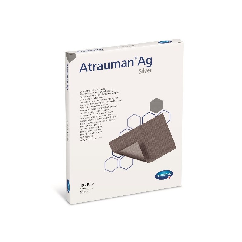 Pansament cu argint, din plasa de poliamida hidrofoba, cu fibre argintate, cu efect antibacterian impotriva bacteriilor gram-negative si gram-pozitive la contactul direct cu pansamentul. Atrauman Ag este impregnat cu unguent neutru fara aditivi de tip vaselina sau alte parafine; permeabil la exsudat. Pansamentul este foarte moale si flexibil, nu adera de suprafata plagii, fiind eficient chiar si la utilizarea pe termen lung, nu favorizeaza sensibilitatea sau alergia si asigura un efect antibacterian ce dureaza pana la 7 zile. Unguentul contine: Combinatie de tip esteri ai acizilor grasi vegetali si naturali, legati ca di / trigliceride, Macrogol 2000. Prezentare: 10 bucati