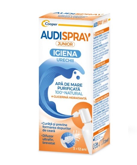 Audispray Junior Solutie, 25 ml, Cooper Indicatii: Audispray junior este o solutie hipertonica pe baza de apa de mare controlata microbiologic care fludifica si dizolva cerumenul permitand dispersarea sa naturala. Audispray junior evita pentru copil, utilizarea bastonasului cu vata care impinge cerumenul spre timpan. Fara gaz propulsor. Audispray junior permite copiilor de la cea mai frageda varsta sa se obisnuiasca sa aiba o igiena regulata a urechii. Audispray junior elimina cu menajament orice exces de cerumen, praf si impuritati, prevenind formarea dopurilor. In caz ca dopul s-a format, Audispray junior faciliteaza extractia sa de catre medic. Contraindicatii: A nu se utiliza fara sfatul medicului in urmatoarele cazuri : otita, dureri de ureche, perforarea timpanului si in cazul persoanelor predispuse ametelilor, sau care au suferit deja o operatie la nivelul urechii sau timpanului. Mod de administrare: Practicati una sau doua presiuni pe varful flaconului tinandu-l vertical. Masati baza urechii timp de 10 secunde. Inclinati capul in aceeasi parte pentru a elimina surplusul si stergeti. Fara a indeparta varful din flacon, nu uitati sa clatiti cu apa fierbinte dupa fiecare utilizare. Daca nu utilizati in mod regulat Audispray, pipeta se poate bloca pentru ca sarea se cristalizeaza. In acest caz scoateti pipeta si inmuiati-o in apa fierbinte timp de 30 de minute. Prezentare: 25ml