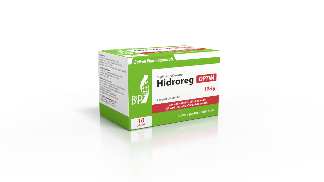 ADNOTARE LA SUPLIMENTUL ALIMENTAR Hidroreg OPTIM pulbere pentru solutie orală este un supliment alimentar cu continut de glucoză anhidră, citrat de sodiu, clorură de sodiu, clorură de potasiu, destinat rehidratării orale. Sărurile pentru rehidratare orală sunt produse destinate compensării pierderii de lichide si electroliti din organism. Glucoza favorizează absorbtia sărurilor si este o sursă de energie, care asigură necesitătile de bază ale organismului. De obicei, insuficienta de electroliti este consecinta unor stări asociate cu pierderea lichidelor din organism, cum sunt: diareea, deshidratarea, febra, etc. RECOMANDARI PENTRU UTILIZARE Rehidratare orală in pierderi de lichide si minerale. MODUL DE ADMINISTRARE Intern, indiferent de luarea meselor. Conţinutul unui pilc se dizolvă intr-o jumătate de litru de apă fiartă şi răcită pană la temperatura camerei. Soluţia preparată se va administra după fiecare scaun lichid, cu inghiţituri mici. Deshidratări uşoare şi moderate: cantitatea administrată depinde de greutatea corporală şi gradul de deshidratare; constituie 40-80 ml/kg corp. In caz de greţuri şi vomă soluţia se va administra in cantităţi mici, in doze repetate. La necesitate iniţial se va administra o cantitate mică de soluţie, cantitatea fiind majorată treptat in dependenţă de toleranţă. In timpul utilizării acestui produs pot fi administrate şi alte lichide, insă se vor evita soluţiile care conţin glucide, deoarece concentraţia mare de glucide poate accentua diareea. Prevenirea deshidratării: pentru preintampinarea pierderilor de lichide din organism se administrează doze mai mici. Doza preparatului este dependentă de masa corporală şi constituie 5-15 ml/kg corp. (50-200 ml după fiecare scaun lichid). Administrarea soluţiei incepe odată cu debutul diareii. De obicei se administrează nu mai mult de 3-4 zile si se sistează odată cu finisarea diareii. Prevenirea dereglărilor echilibrului hidro-electrolitic: in suprasolicitări termice si fizice, insotite de transpiratie abundentă, se administrează solutia cu inghitituri mici la aparitia setei si se intrerupe pe măsura disparitiei ei. Inainte de utilizare consultati medicul. REACTII ADVERSE Este posibilă declanşarea vomei, care denotă o administrare rapidă a produsului. CONTRAINDICATII Hipersensibilitate la componentele produsului. Insuficientă renală, fenilcetonurie, diabet zaharat, hiperkaliemie (nivel crescut al ionilor de potasiu in sange), ocluzie intestinală (obturarea totală sau partială a intestinelor). ATENTIONARI SI PRECAUTII Contine o sursă de fenilalanină. Dacă sunteti gravidă sau alăptati, adresati-vă medicului pentru recomandări inainte de a lua acest produs. Se administrează cu precautie la persoanele cu afectiuni cardiace, hipertensiune arterială, pe fondalul unei diete cu un continut redus de sare, precum si la persoanele cu afectiuni insotite de dereglarea eliminării din organism a potasiului. Se va evita consumul alimentelor bogate in grăsimi si glucide.