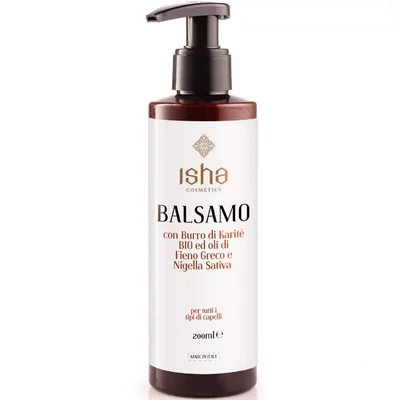 Balsam de par cu unt de shea, 200ml, Isha Isha este o gama de ingrijire a corpului naturala, premium, cu ambalaje si produse de o calitate deosebita. Formulat cu uleiuri virgine de Nigella Sativa si Schinduf, doua uleiuri pretioase obtinute din prima presare la rece a semintelor de Nigella Sativa (numita si chimen negru) si Schinduf in raport de 50:50. Pretioasa sinergia combinata a celor doua uleiuri are proprietati excelente antioxidante, antiinflamatorii si antimicrobiene. Formula imbogatita cu unt de shea (karite) organic, proteine hidrolizate din grau si suc organic de aloe. Balsamul ISHA va reda parul moale si stralucitor datorita actiunii sinergice a ingredientelor active continute. Parul tau va fi descalcit si voluminos, fara incretire. Ingrediente INCI: Aqua (Water), Glycerin, Aloe barbadensis leaf juice, Cetearyl alcohol, Behenamidopropyl dimethylamine, Coco-caprylate/caprate [Coco caprylate/Caprate],Lauroyl arginine, Butyrospermum parkii (Shea) butter, Nigella sativa seed oil, Trigonella foenum graecum seed oil, Hydrolyzed wheat protein,Phenoxyethanol, Lauroyl lysine, Squalane, Tocopheryl acetate, Parfum (Fragrance), Lactic acid, Ethylhexylglycerin, Citric acid, Sodium benzoate,Potassium sorbate, Tetrasodium glutamate diacetate. Testat dermatologic pentru pielea sensibila. Testat hipoalergen pentru nichel. Mod de folosire: Se aplica dupa samponare pe parul umed, masand usor. Se lasa sa actioneze cel putin 5 minute si se clateste bine. Recomandat sa folositi si masca ISHA din aceeasi linie. Produs cosmetic de uz extern. In caz de contact cu ochii, clatiti cu apa curenta din abundenta. Fabricat in Italia. Prezentare: 200 ml