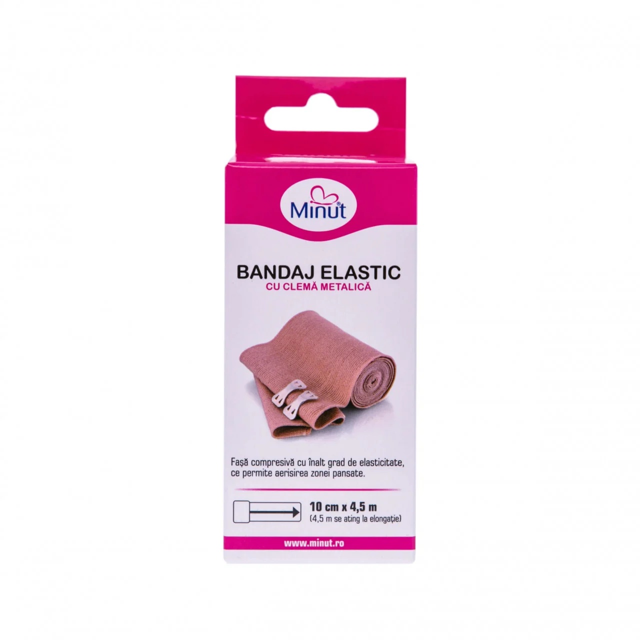 Bandaj elastic cu clema, 10cm x 4,5m, Minut Este utilizat in medicina pentru vene varicoase, rani, intinderi de tendoane, dar si ca material pentru pansamente. Se foloseste pentru fixarea atelelor sau la impachetari pentru tratamente medicale sau cosmetice. Mod de utilizare: Infasurati bandajul in jurul locului cu probleme si fixati-l cu clema. Folositi numai dupa indicatiile medicului. Spalati numai cu apa calda si sapun, clatiți bine, stoarceti, desfasurati si lasati bandajul sa se usuce pe orizontala, fara a-l atarna. Dimensiuni: 10cm x 4.5m Prezentare: 1bucata