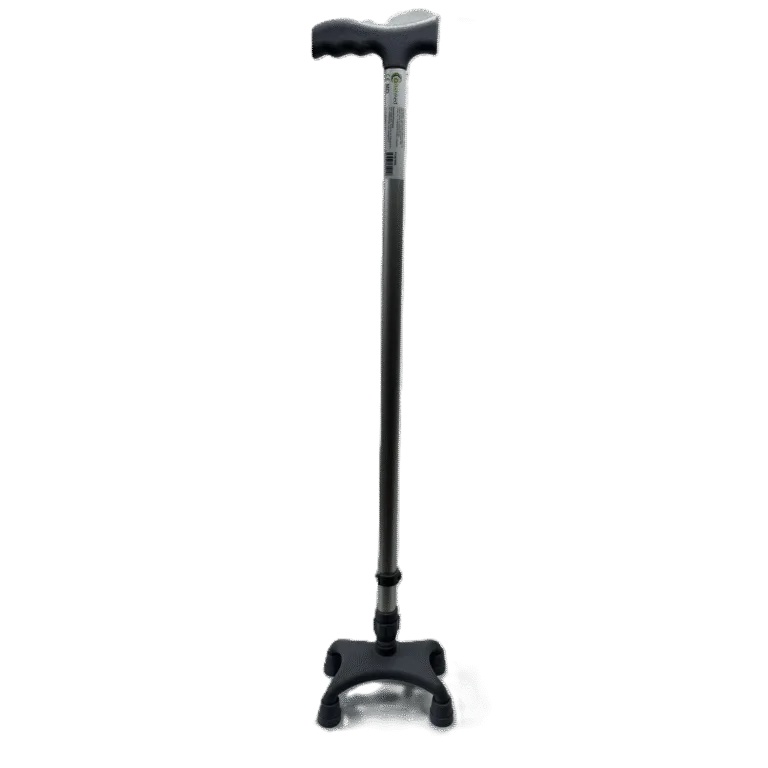 Baston reglabil 4 picioare cu baza ingusta gri, VitalMed Descriere : Bastonul cu 4 picioare este un dispozitiv ortopedic de sprijin proiectat pentru a oferi stabilitate superioară în comparație cu bastoanele clasice. Baza sa cvadripodă (cu patru puncte de sprijin) distribuie greutatea mai uniform, făcându-l ideal pentru persoanele cu echilibru precar sau cu nevoie de susținere fermă în mers. Este recomandat atât în recuperarea medicală, cât și în utilizarea de lungă durată, în special pentru persoane vârstnice sau cu dizabilități. Indicatii de utilizare : Tulburări de echilibru severe Afectări neurologice (AVC, Parkinson, scleroză multiplă) Recuperare după intervenții ortopedice majore Slăbiciune musculară avansată sau instabilitate la mers Sprijin sigur pentru mers în medii interioare și exterioare plane Detalii tehnice : Material cadru : aluminiu ușor sau oțel vopsit, rezistent la coroziune Înălțime reglabilă : interval tipic: 70 – 95 cm Greutate proprie : 1,0 – 1,5 kg Greutate maximă susținută : 100 – 120 kg Mâner : ergonomic (anatomic sau standard), uneori acoperit cu strat moale antiderapant Bază : cu 4 picioare si amortizor din cauciuc antiderapant