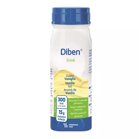Bautura Diben cu aroma de vanilie, 200ml, Fresenius Kabi Aliment dietetic pentru scopuri medicale speciale. Alimentatie enterala, bogata in acizi grasi mononesaturati si carbohidrati modificati cu amidon si fructoza, imbogatita cu vitamine antioxidante C si E, β-caroten, magneziu, crom (co-factor pentru toleranta la glucoza) si fibre solubile, fara gluten si lactoza, sarac in sodiu. Dieta speciala destinata pacientilor cu diabet zaharat si pacientilor cu intoleranta la glucoza de alta cauza, cu risc de malnutritie. Atentionari: A se utiliza numai sub supraveghere medicala. Recomandat pentru nutritie enterala completa (aprox 5 flacoane pe zi) sau numai pentru suplimentarea nutritiei (aprox 2-3 flacoane pe zi). Trebuie asigurat un aport adecvat de lichide. Tratamentul antidiabetic trebuie modificat in functie de rezultatele monitorizarii glicemiei. Produsul nu este recomandat copiilor cu varsta sub 3 ani. A se pastra la temperatura camerei. Flacoanele deschise pot fi pastrate la frigider, cel mult 24 de ore. A se administra lent. A se agita inainte de utilizare! A nu se utiliza, daca ambalajul este deteriorat sau umflat sau continutul este coagulat. A nu se utiliza pe cale parenterala! Ingrediente: Apa, amidon modificat, proteine din lapte, uleiuri vegetale, fructoza, ulei de peste, maltodextrina, trigliceride cu lant mediu, arome, emulsificatori (lecitina din soia, E 471), celuloza, clorura de potasiu, corectori de aciditate (E 524), aroma naturala, stabilizatori (E 452, E 460, E 466), citrat de potasiu, tartrat hidrogenat de colina, vitamina C, clorura de sodiu, vitamina E, pirofosfat de fier, sulfat de zinc, niacina, clorur de sodiu, β-caroten, acid pantotenic, sulfat de cupru, fluorura de sodiu, vitamina B2, vitamina B6, vitamina B1, vitamina A, clorura de crom, acid folic, molibdat de sodiu, selenit de sodiu, iodura de potasiu, vitamina K1, biotina, vitamina D3, vitamina B12, iadulcitor (E954, E952), oxid de magneziu, clorură de mangan, iodura de potasiu. Continut mediu pe 100ml: Valoare calorica 630 kJ (= 150 kcal). Proteine 7.5g. Carbohidrati 13.1g, din care zaharuri 2.5g, fructoza 1.9 g, lactoza≤ 0.5 g. Unitati paine 1.1 BU, unitati carbohidrati 1.3 BU, grasimi 7.0 g din care acizi grasi saturati 1.7g, acizi grasi monosaturati 3.8, acizi grasi polinesaturati 1.5g, acizi grasi cu lant mediu 1.2g. Din care EPA+DHA 0.05g, colesterol ≤ 6.0 mg. Fibre 2.0 g, Apa 79 ml, osmolaritate 350–390* mosmol/l, osmolalitate 440–490* mosmol/kg H2O Minerale si oligo-elemente: Sodiu 65/70* mg, Potasiu 130 mg, Clor 55 mg, Calciu 150 mg, Magneziu 15 mg, Fosfor 95 mg, Fier 2.0 mg, Zinc 1.5 mg, Cupru 300 μg, Mangan 0.4 mg, Iod 30 μg, Fluor 0.2 mg, Crom 10 μg, Molibden 15 μg, Seleniu 10 μg. Vitamine: Vit. A 120 μg, ß-Caroten 300 μg, Vit. D3 2.0 μg, Vit. E 3.0 mg, Vit. K1 16.7 μg, Vit. B1 0.2 mg, Vit. B2 0.3 mg, Niacin 3.0 mg, Vit. B6 0.3 mg, Vit. B12 0.6 μg, Acid pantotenic 1.2 mg, Biotin 7.5 μg, Acid folic 50 μg, Vit. C 15 mg, Colina 26.7 mg. Distributie calorica (energie %): Proteine 20 %, Grasimi 42 %, Carbohidrati 35 %, Fibre 3 %. Prezentare: 200ml