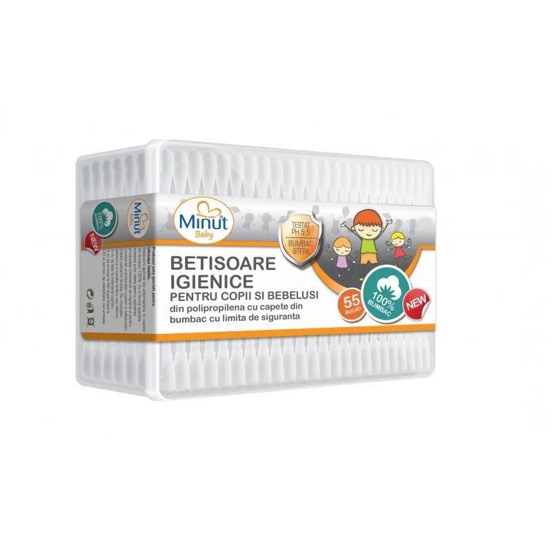 Betisoare de urechi pentru copii si bebelusi, 55 bucati, Minut Cu o forma speciala, betisoarele igienice Minut Baby sunt ideale pentru aplicarea produselor cosmetice de ingrijire si pentru curatarea urechiuselor copiilor si bebelusilor. Evitati miscarile bruste. Nu impingeti betisorul in canalul auditiv sau olfactiv. A nu se lasa la indemana copiilor. Prezentare: 55bucati/cutie