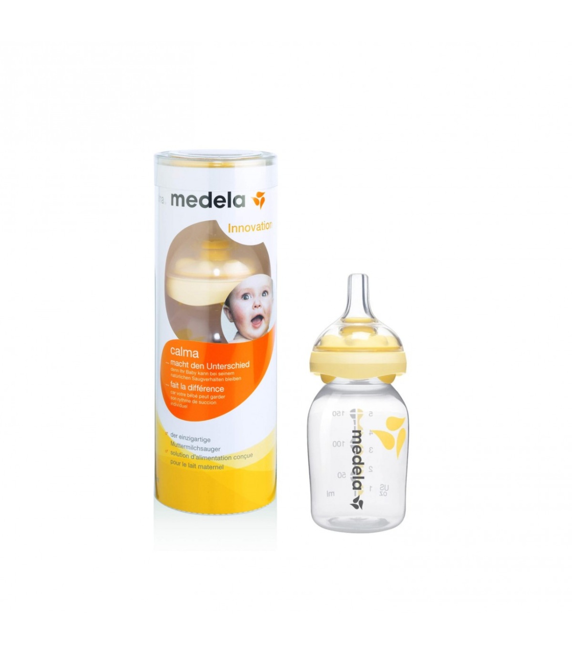 Biberon cu tetina Calma, 150 ml, Medela Medela introduce o soluție revoluționară de hrănire a bebelușului cu lapte matern. Medela Calma – Dispozitiv special de hranire cu lapte matern cu biberon de 150 ml Fara Bisfenol-A Calmă este tetina ideală pentru bebelușii hrăniți la sân dar care pentru o perioadă au nevoie să fie hrăniți artificial, cu lapte matern. Tetina cere un mecanism al suptului similar cu cel al suptului la sân, reducând la minim riscul învățării cu suptul la biberon. Bebelușul poate relua suptul la sân fără nici o dificultate. Proprietati tetina Calma Bebelusul trebuie sa creeze vid pentru ca laptele sa curga. Laptele nu curge automat si in timpul mesei bebelusul poate sa faca pauza ca sa respire. Calma are o singura marime, potrivita pentru toata perioada alaptarii. Cu Calma puteti mentine legatura unica oferita de alaptare, pentru mai mult timp. Alaptarea trebuie sa fie bine stabilita inainte de introducerea Calma. Chiar daca tetina dispozitivului Calma pare cam lunga, nu va temeti, ea are lungimea perfecta. Dupa cum poate stiti, mamelonul dvs. se lungeste de pana la 2 ori in gura bebelusului. Avand aceasta lungime, Calma ajunge astfel la fel de departe in gura bebelusului. Totusi este important ca bebelusul sa aiba o pozitie corecta atat la san, dar si cand utilizeaza Calma. In timpul alaptarii, laptele nu curge automat. Pentru a facilita fluxul de lapte, bebelusul trebuie sa creeze vid. In timpul alaptarii, laptele curge atunci cand vidul din gura bebelusului este maxim. In aceste momente, limba bebelusului este in cel mai jos punct si mamelonul este tras adanc in gura lui. Acelasi lucru se intampla si cu Calma. Bebelusul trebuie sa faca un efort ca sa creeze vid, pentru ca laptele sa curga. Calma ajuta la prevenirea colicilor intrucat, cu sistemul unic de control al aerului, permite ventilarea biberonului. Spre deosebire de o tetina, Calma elimina aerul indiferent de cat de bine a fost stransa. Chiar daca tineti biberonul inclinat la 45° (pozitia normala pentru hranire), nu curge. Bebelusul trebuie sa aplice o anumita forta de aspiratie pentru a face laptele sa curga. Uneori, la sfarsitul mesei, este posibil sa curga putin lapte, daca bebelusul da drumul tetinei dispozitivului, inainte de a termina portia de lapte trasa din biberon. Materiale Biberon/Capac filetat/Capac multifunctional – polipropilena Tetina – silicon Baza/ Elementul superior– polipropilena si elastomer termoplastic Prezentare: Biberon 150 ml din prolipopilena și 1 tetina Calma.