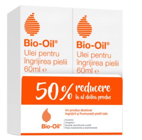Bio-Oil Ulei, 60ml 1+1-50% reducere la al doilea In perioadele de schimbare rapida a greutatii pielea se sparge si se formeaza vergeturile. Acestea sunt vizibile la suprafata pielii. Probabilitatea de a dezvolta vergeturi poate varia in functie de tipul de piele, rasa, varsta, dieta si nivelul de hidratare a pielii. Cei mai predispusi la formarea vergeturilor sunt femeile insarcinate, cei care practica culturism, adolescentii si in general, acele persoane care intr-o perioada scurta cresc mult in greutate. Vergeturile au natura permanenta si chiar daca Bio Oil este formulat astfel incat sa imbunatateasca aspectul acestora, nu le poate indeparta definitiv. Rezultatele pot varia de la o persoana la alta. Mod de utilizare: Pentru cicatrici: Cicatricile fac parte din procesul de vindecare al unei rani si se formeaza ca urmare a unei supra-productii de colagen in zona afectata. O data cu trecerea timpului, cicatricile se mai pot schimba, dar raman ca semne permanente. Bio Oil este astfel conceput pentru a imbunatati aspectul cicatricilor, dar nu le poate indeparta. Aplicati Bio Oil pe cicatrice de 2 ori pe zi, masand usor printr-o miscare circulara si folositi minim 3 luni. Pentru cicatricile noi, nu aplicati Bio Oil decat dupa ce rana este complet vindecata. Nu folositi pe pielea cu leziuni. Rezultatele pot varia de la o persoana la alta. Pentru vergeturi: Aplicati Bio Oil pe zonele afectate de vergeturi de 2 ori pe zi, masand usor printr-o miscare circulara, timp de cel putin 3 luni. In timpul sarcinii, ar trebui sa aplicati Bio Oil de la inceputul celui de-al doilea trimestru si in special in zonele predispuse aparitiei vergeturilor, cum ar fi abdomenul, sanii, partea inferioara a spatelui si partea superioara a coapselor. Rezultatele pot varia de la o persoana la alta. Pentru nuanta neuniforma a pielii: Aspectul neuniform al pielii apare ca urmare a productiei insuficiente de melanina din organism. Acest lucru poate fi declansat de cauze externe, cum ar fi expunerea indelungata la soare sau folosirea unor produse de albire a pielii de slaba calitate; sau de cauze interne, cum ar fi fluctuatiile hormonale din timpul sarcinii, menopauza sau folosirea contraceptivelor. Bio Oil ajuta la imbunatatirea aspectului nuantei neuniforme a tenului. Aplicati Bio Oil de 2 ori pe zi pentru o perioada de minim 3 luni. Bio Oil nu contine factor de protectie solara. Daca folositi un produs de protectie solara, aplicati Bio Oil abia dupa ce acesta s-a absorbit complet in piele. Rezultatele pot varia de la o persoana la alta. Pentru piele imbatranita: Ridurile apar in mare parte din cauza scaderii productiei de colagen si elastina din piele. Bio Oil contine numeroase ingrediente care ajuta la mentinerea fermitatii pielii. Aceasta devine matasoasa, hidratata si supla, prevenind astfel aparitia ridurilor. Bio Oil hidrateaza pielea in profunzime, si imbunatateste textura si aspectul ridurilor fine dar si a celor profunde. Aplicati Bio Oil de 2 ori pe zi pe zonele afectate de riduri. Rezultatele pot varia de la o persoana la alta. Pentru piele deshidratata: La suprafata pielii se afla o pelicula invizibila de ulei care actioneaza ca bariera protectoare, mentinand nivelul optim de hidratare. Intr-un climat foarte uscat, acest strat lipidic nu este suficient si se pierde prea multa prin piele. Dusurile si baile zilnice pot agrava acest proces indepartand stratul lipidic din cauza efectului astringent al apei si al sapunului. Bio Oil suplimenteaza stratul de ulei natural al pielii, ajutand la refacerea functiei de mentinere a unui nivel optim de hidratare. Aplicati Bio Oil de 2 ori pe zi pe zonele afectate. Rezultatele pot varia de la o persoana la alta. Prezentare: pachet de 1+1 a cate 60ml fiecare
