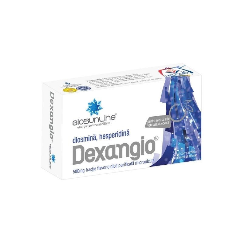 La Biosunline comprimatele cu diosmina si hesperidina sunt produse din materii prime standardizate, atent selectionate, aprobate si avizate de Institutul National de Cercetare Dezvoltare pentru Bioresurse Alimentare (INCDBA), iar productia acestora se deruleaza in conformitate cu standardele sistemului de buna practica de fabricatie a medicamentelor GMP (Good Manufacturing Practice). In acest fel iti garantam siguranta si calitatea inalta a produsului Dexangio.Dexangio, prin ingrediente sale active, diosmina si hesperidina: ajuta la functionarea normala a venelor, in special la nivelul membrelor inferioare.