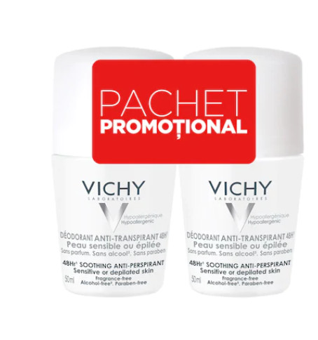 VICHY Bipack DEO Roll on fara parfum eficacitate 48h, 2x 50mlDeodorant roll-on antiperspirant destinat pielii sensibile sau epilate. Pentru femeile cu pielea sensibila sau epilata, care doresc sa combine toleranta cu eficacitatea unui produs anti-perspirant. Eficacitate Deodorant roll-on antiperspirant cu formula delicata, special conceputa pentru pielea sensibila si epilata. Principiile antiperspirante, combinate cu ingredientul cu efect calmant Proline Cutei, asigura un maxim de toleranta si o eficacitate antiperspiranta timp de 48 de ore. Deodorant antiperspirant cu eficacitate 48h. Aplicare Aplicati dantiperspirantul pentru piele sensibila zilnic in zona axilelor, pe pielea curata si uscata. Siguranta Deodorant roll-on fara parfum cu formula testata pe pielea sensibila, sub control dermatologic, hipoalergenica, fara alcool, fara parabeni. Un antiperspirant pentru piele sensibila. Compozitie AQUA / WATER – ALUMINUM CHLOROHYDRATE – PPG-15 STEARYL ETHER – CETEARYL ALCOHOL – CETEARETH-33 – DIMETHICONE – IODOPROPYNYL BUTYLCARBAMATE – NYMPHAEA ALBA EXTRACT / NYMPHAEA ALBA FLOWER EXTRACT – SODIUM PALMITOYL PROLINE. Forma de prezentare Pachet: Flacon 50 ml + Flacon 50 m