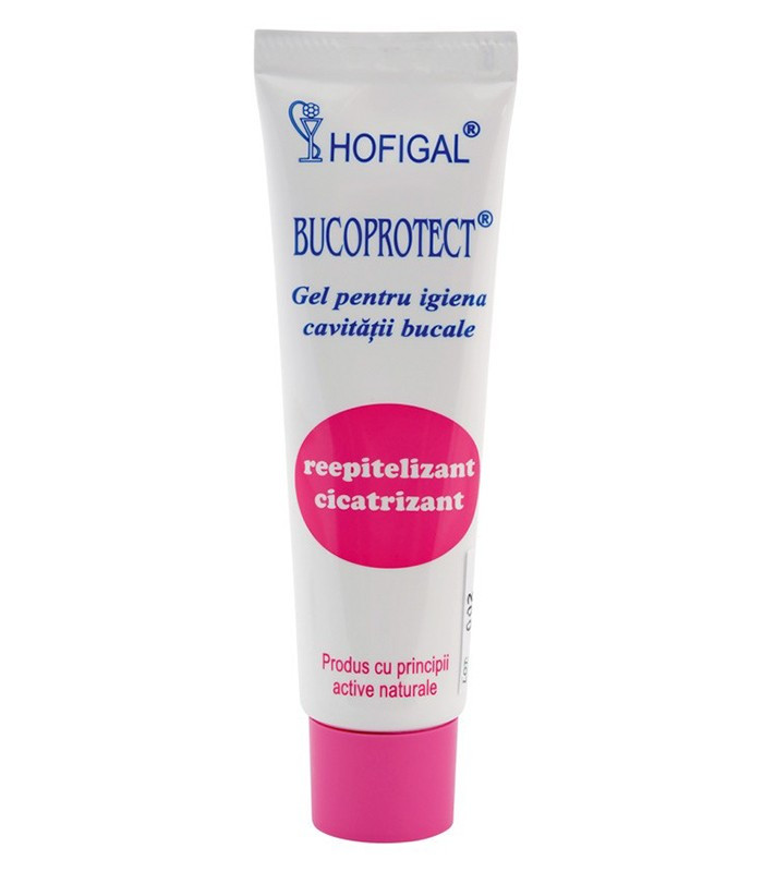Gel pentru igiena cavitatii bucale Bucoprotect, 50 ml, Hofigal Proprietati: Are actiune antiseptica, antiinflamatoare, cicatrizanta, stimuleaza troficitatea mucoasei cavitatii bucale si gingivale, reduce durerile cauzate de afectiunile specifice cavitatii bucale si combate mirosul neplacut. Actiune: Este un gel destinat igienei si ingrijirii cavitatii bucale. Recomandari: Contine tincturi de trais