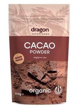 Cacao pudra eco, 200g, Dragon Superfoods -raw, fara gluten- Pudra organica de cacao extrasa prin procedee mecanice, la rece. Adaugati pulberea in deserturi, lapte, smoothie-uri sau orice reteta in care nu poate lipsi gustul delicios de ciocolata. Ingrediente: cacao 100% Valori nutritionale/100g: Energie: 1738kj / 413kcal Grasimi: 11g din care saturate 7.2g Carbohidrati: 49g din care zaharuri 1.0g Fibre 4.7g Proteine: 26g Saruri: 0.0g Magneziu: 95 mg Teobromina: 1.75 g Produs certificat ecologic. Prezentare: 200g