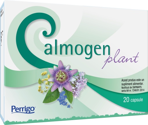 Calmogen Plant este un supliment alimentar util în: – anxietate (stare de neliniște, de așteptare încordată însoțită de palpitații, jenă la respirație etc. întâlnită în unele boli de nervi); – iritabilitate (ca tonic general, relaxant, sedativ, calmant – produce o liniștire a stărilor de agitație psihică sau motorie); – antiaritmic (pentru palpitații); – antispastic; – tulburări de somn. Compoziție: Floarea pasiunii (passiflora) extract – 50 mg; Hamei (hamulus lupulus) extract – 50 mg; gintură (gențiană) extract- 20 mg; valeriană (valeriana officinalis) extract – 50 mg. Mod de administrare: Adulți: 1 capsulă de 3 ori pe zi. Atenționări speciale: Sarcină și alăptare. Ulcer. Hipertensiune arterială (HTA). Alergie cunoscută la oricare dintre constituenți. Boli renale. Boli cardiace. Dietă hiposodată (dietă fără sare). Sângerare rectală. Prezentare: 20 capsule