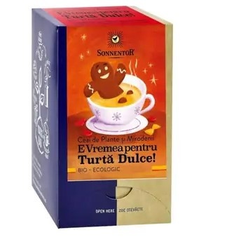 Ceai E vremea pentru Turta Dulce! Brand-ul Sonnentor are ca deviza “ Unde bucuria creste in mod natural” si se bazeaza pe comertul echitabil si durabil si pe agricultura ecologica din intreaga lume, indiferent daca materiile prime provin din Austria sau Tanzania. Ceaiul Bio E Vremea pentru Turtă Dulce este un ceai fin de desert ce te incalzeste in perioada rece si umple casa cu arome de scortisoara si de turta dulce. Mod de utilizare: • Pentru o cana de ceai, turnati apa fierbinte peste un pliculet de ceai. • Timp infuzare: max. 10 minute, temperatura apei: 100°C. Compozitie: Hrisca prajita Ecologica, Frunze de mur dulce (tian cha) Ecologic, Scortisoara Cassia Ecologica, Portocale rosii Ecologice, Ienibahar Ecologic, Busuioc sfant Ecologic, Ghimbir Ecologic, Cuisoare Ecologice, Anason stelat Ecologic, Anason Ecologic, Cardamom Ecologic, Piper negru Ecologic. Prezentare: 18 plicuri.