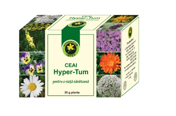 Ceai Hyper-Tum antitumoral, 30g, Hypericum Proprietati: poate contribui in stimularea imunității organismului (creșterea fagocitozei). se recomanda si un regim alimentar bogat în fructe și semințe; evitarea poluării, stresului. Mod de administrare: Intern : infuzie – o linguriță plantă la 200 ml apă clocotită; se lăsă acoperit 10 minute Ingrediente: Busuioc de câmp, năpraznic, sânziană, fenicul, cătină, tătăneasă, rostopască, busuiocul cerbilor, mentă, nuc, talpa gâștei, porumb, podbal, morcov de câmp, turiță, urzică, aloe, coada șoricelului, coriandru, mușețel, pătrunjel. Prezentare: 30g