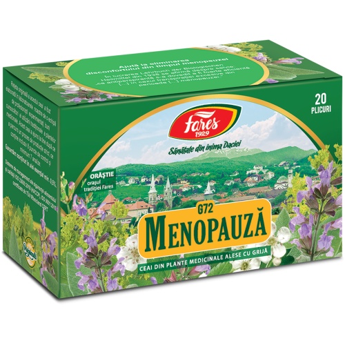 Ajuta la mentinerea confortului fizic si psihic al femeilor aflate la menopauza Ingrediente: Salvie (Salviae herba), fructe de fenicul (Foenicul fructus), lucerna (Medicaginis herba), cretisoara (Alchemillae herba), radacina de lemn dulce (Liquiritiae radix), frunze de rozmarin (Rosmarini folium), frunze si flori de paducel (Crataegi folium cum flore), flori de lavanda (Lavandulae flos).Efect: Estrogenic, antioxidant, tonic, calmant, imbunatateste circulatia sangelui.Recomandari: Simptome caracteristice menopauzei: bufeuri, insomnii, iritabilitate, nervozitate.Precautii: HipotensiunePreparare: Peste un plic se toarna 200 ml apa clocotita si se lasa 10-15 minute acoperit.Mod de administrare: Se beau 3-4 cani cu ceai pe zi. Prezentare: 20 plicuri