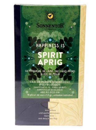 Ceai BIO Happiness is Spirit Aprig CU PATRUNJEL DE CAMP, TREI FRATI PATATI SI ACE DE MOLID! LIBER, NEIMBLANZIT SI FEERIC! Beneficii: Acest amestec evoca aroma de padure si lunca in ceasca, asigurand senzatii nelimitate de gust. Un companion fermecator la vanat si bucate cu ciuperci. Compoziție: Boabe de ienupar, 22% patrunjel de camp, cimbrisor, patlagina, frunze de alun, frunze de mesteacan, 5% trei frati patati, urzica, banutei si 1,5% ace de molid. Prezentare: 18 plicuri
