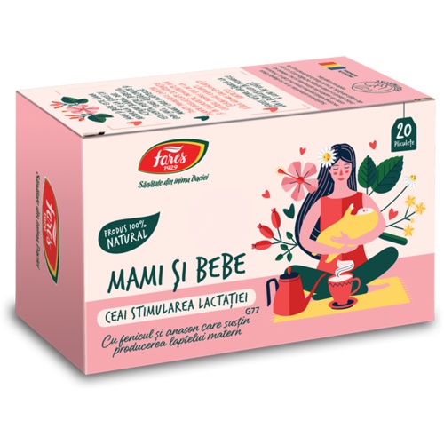 Ceai stimularea lactatiei, 20 plicuri, Fares Ceai Mami si Bebe susține lactația la mamele care alăptează si aduce beneficii si pentru bebelus. Beneficii: ● recomandat pentru mame în perioada alăptării; ● galactogog (ajuta secreția lactată). Contraindicații: La dozele recomandate nu se cunosc. Efecte secundare și interacțiuni: la dozele recomandate nu se cunosc. Mod de administrare: Se beau 3-4 căni cu ceai pe zi. Peste un plic se toarnă 200 ml apă clocotită și se lasă 10 minute acoperit. Condiții de păstrare: La loc uscat și la temperatura mediului ambiant. Ingrediente: Fructe anason (Fructus Anisi), fructe de fenicul (Fructus Foeniculi), fructe de chimion (Fructus Carvi), urzica (Herbă Urticae), roiniță (Herbă Melissae), cimbrișor (Herba Serpylli), menta (Herba Menthae). Prezentare: 20 plicuri x 1.5 g