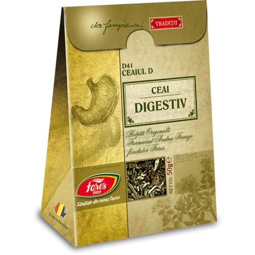 Susține buna funcționare a aparatului digestiv, ajutând la eliminarea disconfortului gastrointestinal. Datorită compoziției sale complexe, acest ceai are acțiune tonic aperitivă, stimulentă a secrețiilor digestive, carminativă (prin uleiuri esențiale, principii amare, flavone). Camazulena din mușețel și flavonele din coada șoricelului conferă proprietăți antiinflamatoare, astringente, cicatrizante. Anasonul și mușețelul au în plus acțiuni calmante și antialgice. Ingrediente: Flori de mușețel (Chamomillae flos), fructe de anason (Anisi fructus), fructe de fenicul (Foeniculi fructus), coada șoricelului (Millefolii herba). Recomandări: Inapatentă, digestie lentă, dispepsii, gastralgii, colici intestinale, meteorism abdominal (balonare), enterite. Contraindicații: La dozele recomandate nu se cunosc. Nu se indică administrarea la sugari. Efecte secundare și interacțiuni: La dozele recomandate nu se cunosc. Sarcină și alăptare: Nu este indicat femeilor însărcinate și mamelor care alăptează Preparare: Peste 1-2 lingurițe de amestec de plante se toarnă o cană cu apă clocotită și se lasă 10-15 minute acoperit, apoi se strecoară. Mod de administrare: Se beau 3-4 căni cu ceai pe zi cu o jumătate de oră înainte de masă. Durata unei cure obișnuite este de 6-8 săptămâni, sau conform recomandării medicului.