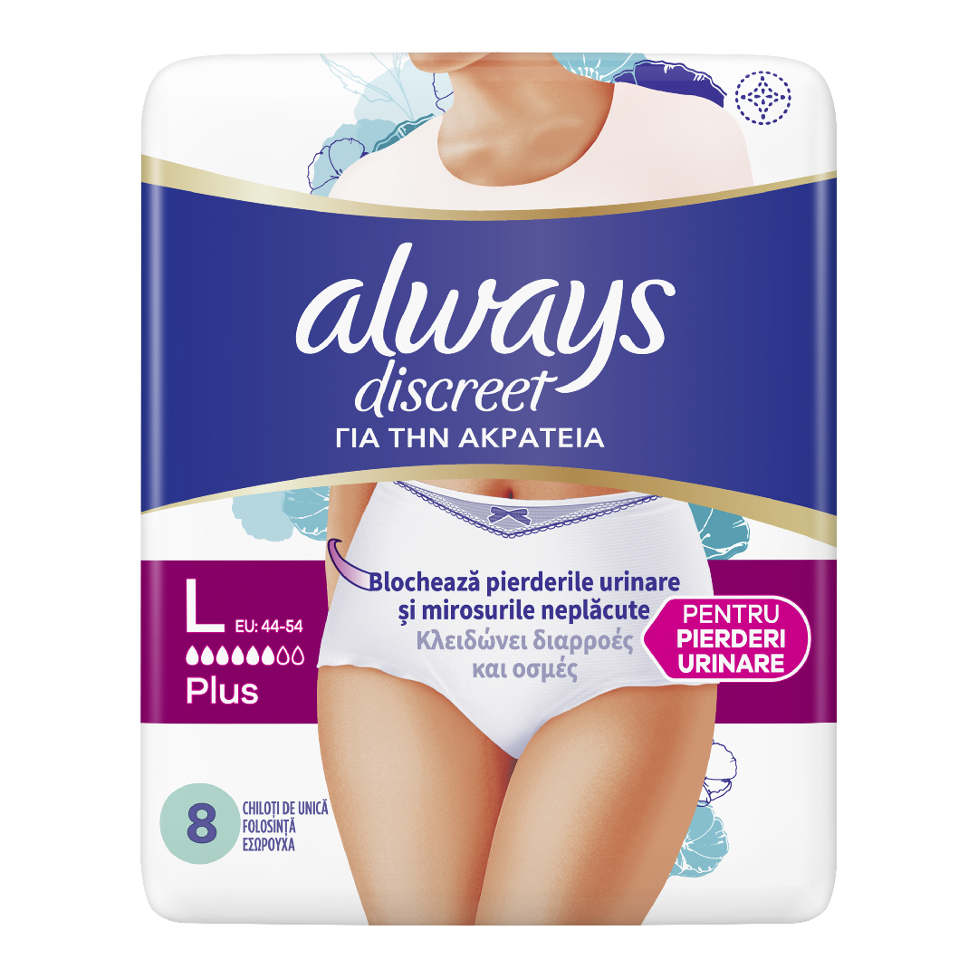 Când te confrunți cu scurgeri ușoare, moderate sau chiar abundente, absorbantele Always Discreet îți oferă protecție sigură împotriva scurgerilor și a mirosurilor neplăcute, asigurând totodată discreție deplină. Alege dintre diferite dimensiuni și niveluri de absorbție, pentru a găsi varianta potrivită nevoilor tale.