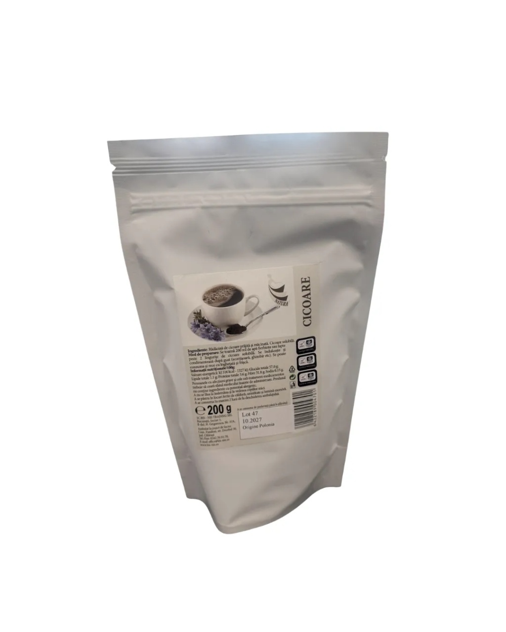 Cicoare solubila, 200g, Bis-Nis Cicoare Solubilă Bis-Nis – 200 g este o băutură naturală, fără cofeină, ideală ca alternativă la cafea. Bogată în inulină, o fibră alimentară solubilă cu efect prebiotic, poate susține digestia, tranzitul intestinal și eliminarea toxinelor, oferindu-ți energie și claritate mentală fără stimulenți. Beneficii principale: Poate ajuta la combaterea oboselii și la stimularea concentrării; Susține digestia și funcția normală a intestinelor; Contribuie la eliminarea toxinelor din organism; Fără cofeină, potrivită pentru cei care doresc să reducă consumul de cafea; Conține inulină, o fibră alimentară naturală cu efect prebiotic. Mod de preparare: Se dizolvă 2 lingurițe de cicoare solubilă în 200 ml apă fierbinte sau lapte; Se poate îndulci și condimenta după preferințe (scorțișoară, ghimbir etc.); Se poate consuma și rece, ca topping pentru înghețată sau cu frișcă. Ingrediente: Cicoare solubilă (conține inulină – fibră alimentară naturală). Cantitate: 200 g Atenționări: A nu se consuma în exces; A se păstra într-un loc uscat și ferit de lumină; Nu este recomandat copiilor foarte mici fără consult medical.