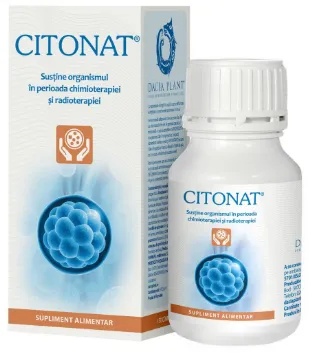 Citonat, 150 comprimate, Dacia Plant Proprietăți: Produs natural care conține 9 plante medicinale remarcabile din flora românească și internațională, ale căror proprietăți contribuie la protejarea organismului în perioada tratamentului cu medicamente citostatice și/sau radioterapiei și la menținerea în limite normale a procesului de multiplicare celulară la nivelul organelor și țesuturilor. funcționarea normală a procesului de diviziune celulară, prin inducerea procesului de autodistrugere a celulelor modificate; funcționarea normală a sistemului imunitar, prin normalizarea secreției de: interferon, factor de necroză tumorală (TNF- α), interleukine 1,2,8, limfocite B, celule NK (natural killer), celule T supresoare și macrofage; protejarea organismului împotriva efectelor secundare ale chimioterapiei și radioterapiei; buna funcționare a hematopoezei; creșterea rezistenței organismului la infecții; îmbunătățirea tonusului și vitalității celulare; protejarea celulelor împotriva stresului oxidativ. Ingrediente: Celuloza microcristalină, cordyceps (Cordyceps sinensis)-extract hidroalcoolic din miceliu, cu 20% polizaharide (200 mg), ganoderma (Ganoderma lucidum) – extract hidroalcoolic cu 20% polizaharide (200 mg), agaricus (Agaricus blazei)- extract hidroalcoolic cu 20% polizaharide (100 mg), ashwagandha (Withania somniferă) – pulbere din rădăcini (100 mg), astragalus (Astragalus membranaceus) – extract hidroalcoolic 10:1 din rădăcini (100 mg), oldenlandia (Oldenlandia diffusa)- extract hidroalcoolic 5:1 din părți aeriene (100 mg), rostopasca (Chelidonium majus)- părți aeriene (100 mg), goji (Lycium barbarum) – extract hidroalcoolic cu 40% polizaharide din fructe (50 mg), coriolus (Coriolus versicolor) – extract hidroalcoolic cu 20% polizaharide (50 mg), dioxid de siliciu coloidal, ștearat de magneziu. Mod de administrare: Adulți: în prima săptămână se administrează câte 1 comprimat de 3 ori pe zi, pe stomacul gol, cu 15-20 de minute înaintea mesei. Din a doua săptămână, se administrează câte 2 comprimate de 3 ori pe zi, pe stomacul gol, cu 15-20 de minute înaintea mesei. Persoanele cu greutate corporală peste 80 kg pot crește doza până la 8 comprimate pe zi (câte 2 comprimate de 4 ori pe zi). Tineri între 15 și 18 ani: câte 1 comprimat de 3 ori pe zi, pe stomacul gol, cu 15-20 de minute înaintea mesei. Copii sub 14 ani: după sfatul medicului. Se recomandă utilizarea în cure succesive, de 3 luni, cu o lună pauză între ele. Pe perioada pauzei, se recomandă a se realiza o cură de detoxifiere cu BIOZHEOLYTH comprimate (câte 1 comprimat de 3 ori pe zi, administrat înaintea mesei) și DETOXIFIANT tinctura (câte o linguriță de tinctură, diluată în 100ml de apă, de 3 ori pe zi, administrată înaintea mesei). Pentru persoanele care au contraindicație la alcool, se recomandă administrarea produsului DETOXIFIANT comprimate (câte 1 comprimat de 3 ori pe zi, administrat înaintea mesei). Comprimatele se înghit cu apă sau se sfărâmă în gură (absorbția substanțelor bioactive este mult mai rapidă). În caz de dificultate la înghițire, comprimatele se pot rupe în două. Prezentare: 150 comprimate