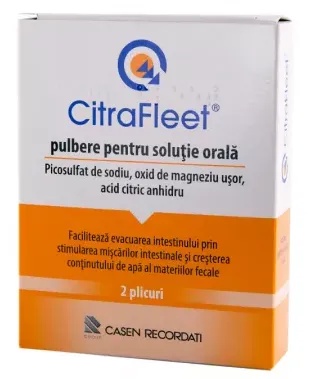CitraFleet se recomanda pentru curățarea intestinului (cunoscut şi sub denumirea de intestin subţire şi colon) înainte de a efectua o procedură de diagnostic ce necesită un intestin curat, de exemplu colonoscopie (procedură prin care se vizualizează interiorul intestinului cu ajutorul unui instrument lung, flexibil, pe care medicul îl introduce prin anus) sau examinare cu raze X. CitraFleet este o pulbere care are gust şi miros de lămâie. Acesta conţine două tipuri de laxative amestecate în fiecare plic care, atunci când sunt dizolvate în apă şi băute, au efect de spălare şi curăţare a intestinului. Este important să aveţi intestinul golit, curăţat, pentru ca medicul sau chirurgul să îl poată vedea clar. CitraFleet este indicat la adulți (inclusiv vârstnici) cu vârsta de 18 ani sau peste. Contraindicatii: Nu luaţi CitraFleet dacă sunteţi alergic la picosulfat de sodiu, oxid de magneziu, acid citric sau la oricare dintre celelalte componente ale acestui medicament. Precautii: Înainte să luaţi CitraFleet, adresaţi-vă medicului dumneavoastră sau farmacistului. Sarcina, alăptarea şi fertilitatea: Dacă sunteţi gravidă sau alăptați, credeți că ați putea fi gravidă sau intenţionaţi să rămâneţi gravidă, adresaţi-vă medicului sau farmacistului pentru recomandări înainte de a lua acest medicament. Conducerea vehiculelor şi folosirea utilajelor: Nu conduceţi vehicule şi nu folosiţi scule sau utilaje dacă începeţi să vă simţiţi ameţit sau obosit după ce luaţi CitraFleet. Mod de administrare: Fiţi pregătit să aveţi scaune moi, frecvente, în orice moment după ce luaţi o doză de CitraFleet. Acest lucru este normal şi indică faptul că medicamentul își exercită acțiunea. Poate fi important să vă asiguraţi accesul la o toaletă până când dispar efectele medicamentului. Este important să urmați o dietă specială (cantități reduse de alimente solide) în ziua dinaintea planificării procedurii. Când începeți să luați plicurile din acest medicament, nu trebuie să mâncați deloc alimente solide, până după terminarea procedurii. Trebuie să urmați întotdeauna dieta prescrisă de medic. Dacă aveți întrebări, adresați-vă medicului dumneavoastră sau farmacistului. Cu excepţia cazului în care medicul dumneavoastră vă recomandă altfel, nu trebuie să luaţi o doză mai mare decât doza recomandată pe o perioadă de 24 ore. Schema de tratament: Trebuie să vi se dea două plicuri de CitraFleet. Fiecare plic conţine o doză pentru adulţi. Tratamentul poate fi administrat într-unul din cele două moduri: Un plic în seara dinaintea efectuării procedurii și al doilea plic în dimineața zilei în care se efectuează procedura sau un plic după amiaza și al doilea plic în seara dinaintea efectuării procedurii. Această schemă este recomandată când procedura este planificată dimineața devreme sau ambele plicuri în dimineața zilei când se efectuează procedura. Acestă administrare este potrivită doar atunci când procedura este planificată după amiaza/seara. Perioada de timp între administrarea celor două plicuri trebuie să fie de cel puțin 5 ore. Fiecare plic trebuie reconstituit într-un pahar cu apă. Nu diluați în continuare medicamentul prin consumarea de lichide imediat după administrarea fiecărui plic. Așteptați zece minute după ce luați fiecare plic, apoi beți aproximativ 1,5-2 litri de diferite lichide limpezi, cu o frecvenţă de aproximativ 250 ml (un pahar) până la 400 ml (un pahar mare) pe oră. Pentru evitarea deshidratării se recomandă supe limpezi și/sau soluții echilibrate de electroliți. Se recomandă să nu se consume doar apă plată sau demineralizată. După ce ați luat al doilea plic și ați băut 1,5-2 litri de lichid, nu beți și nu mâncați nimic timp de cel puțin 2 ore înainte de procedură sau după cum v-a spus medicul dumneavoastră. Dacă aveţi orice întrebări suplimentare cu privire la acest medicament, adresaţi-vă medicului dumneavoastră, farmacistului sau asistentei medicale. Compozitie: Substanţele active sunt picosulfat de sodiu 10,0 mg, oxid de magneziu uşor 3,5 g, acid citric 10,97 g per plic. Celelalte componente sunt hidrogenocarbonat de potasiu, zaharină sodică, aromă de lămâie (aromă de lămâie, maltodextrină, tocoferol E307). Prezentare: 2 plicuri Atentionare: Citiţi cu atenţie şi în întregime prospectul înainte de a începe să utilizaţi acest medicament deoarece conţine informaţii importante pentru dumneavoastră. Prospect: www.anm.ro/_/_PRO/PRO_9349_10.10.16.pdf