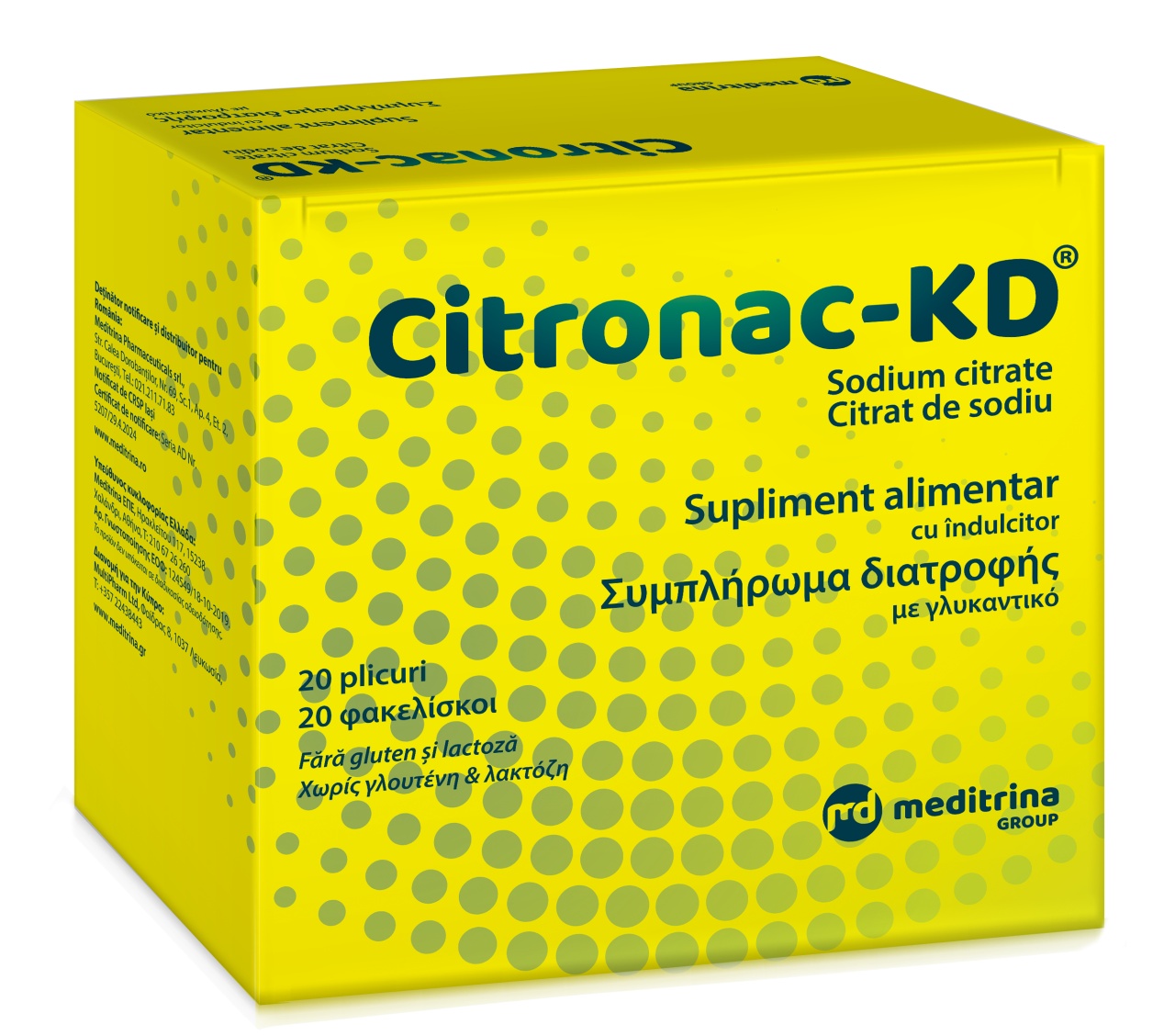 CITRONAC-KD®: Supliment alimentar 1. Ce este CITRONAC-KD® Citronac-KD® este un supliment alimentar fără gluten și lactoză, care conține citrat de sodiu. 2. Ingrediente Aromă : pulbere de suc de lămâie (Citrus Limon, maltodextrină) Substanță activă : citrat de sodiu Aromă : lămâie Anti-aglomerant : dioxid de siliciu Coloranți : roșu sfeclă (E162), riboflavine (E101) Îndulcitori : glicozide steviolice din stevie 97% (Ε960a) 3. Mod de utilizare Doza recomandată de Citronac-KD® este de 2 plicuri pe zi, unul dimineața și unul seara. Doza de seară este mai importantă. Fiecare plic trebuie reconstituit cu 200 ml apă sau suc de fructe. Citronac-KD® poate fi consumat cu sau fără alimente. 4. Atenționări Acest produs este un supliment alimentar și nu poate înlocui o dietă variată și echilibrată și un mod de viață sănătos. A nu se depăși doza zilnică recomandată. Acest produs nu este destinat prevenirii, tratamentului sau vindecării vreunei boli. Consultați medicul dacă sunteți însărcinată, alăptați sau luați medicamente cu sau fără prescripție medicală. A nu se lăsa la îndemâna și la vederea copiilor mici. A se păstra la temperaturi sub 25°C, ferit de căldură, de razele soarelui și de contactul cu apa. Nu utilizați acest produs după data de expirare inscripționată pe ambalajul exterior. 5. Ambalaj Cutie de carton care conține 20 de plicuri de Citronac-KD® și un prospect cu informații pentru utilizator. Greutate netă: 132 g. Deținător notificare și distribuitor pentru România: Meditrina Pharmaceuticals srl. Str. Calea Dorobanților, Nr. 69, Sc. 1, Ap. 4, Et. 2, București.