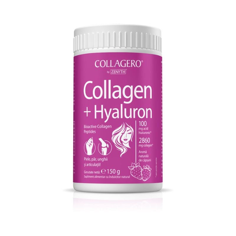 Collagen + Hyaluron este un supliment alimentar pe baza de colagen Verisol® si acid hialuronic, sub forma de pulbere. Colagenul Verisol® este un amestec de peptide bioactive, obtinute printr-un proces patentat de hidroliza a colagenului de tip I si III.Colagenul este proteina constituenta a tesutului conjunctiv (piele, oase, ligamente). Colagenul intra in componenta muschilor, cartilajelor articulare, discurilor intervertebrale, oaselor, tendoanelor, organelor interne, pielii, parului sau unghiilor.Administrat intern, colagenul reprezinta o sursa concentrata de aminoacizi (glicina, prolina, lizina). Sub forma de suplimente, colagenul poate fi folosit pentru protejarea pielii, parului, unghiilor, articulatiilor, pentru refacerea dupa exercitii fizice intense.
