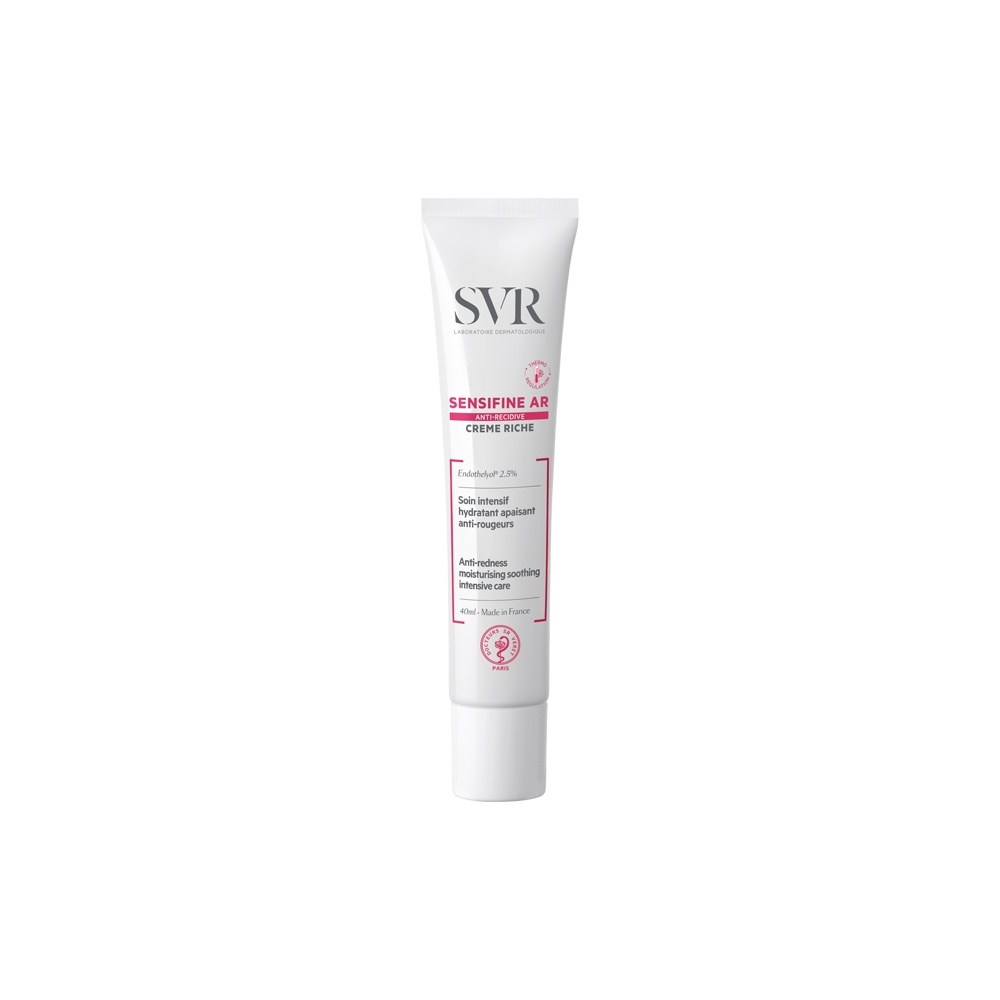 Crema antirecidiva Sensifine AR Riche Proprietati : crema intensiv hidratanta, calmanta, anti-roseata; pentru piele uscata si sensibila, cu tendinta cuperozica, roseata permanenta sau pasagera, mici vase de sange aparente. contine Endothelyol 2.5%; inovatie termo-reglatoare, active cu effect revigotant ce stopeaza senzatia de supra-incalzire, calmeaza instantaneu si durabil senzatia de roseata si caldura + actiune acti-recidiva pentru prevenirea re-aparitiei senzatiei de supra-incalzire; crema reconfortanta, hidratanta, 24h cu finish non gras, nu curge, pigmenti verzi ce neutralizeaza nuanta rosie; este hipoalergenica, non comedogena, nu contine parabeni sau conservanti. Ingredienet active: Endothelyol 25.5% – diminueaza roseate, amelioreaza micro-circulatia, reduce vizibilitatea vaselor aparente. Extract de Ligviritia – calmeaza si decongenstioneaza. Squalan + Unt Karite hidrateaza si hranesc in perfecta Bio afinitate. Eficienta dovedita pe piele sensibila cu roseate. Mod de utilizare: Aplicati dimineata sis au sear ape pielea curata. Prezentare: 40 ml
