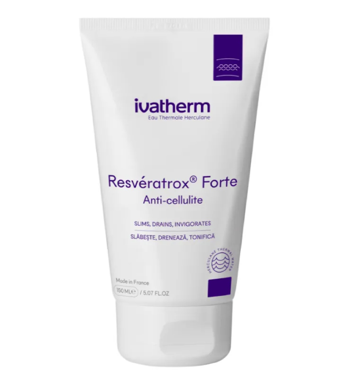 Crema anticelulitica Resveratrox Forte, 150 ml, Ivatherm Ingrijire anti-celulitica. Proprietati: – efect intens de reducere a stratului lipidic de pe coapse, fese si abdomen. – determina reducerea semnificativa a aspectului de coaja de portocala si remodelarea siluetei; – reduce grosimea stratului adipos prin stimularea degradarii grasimilor si impiedicarea formarii de noi depozite adipoase; – res