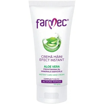 Crema de maini cu aloe vera, 100ml, Farmec Crema inlatura senzatia de maini uscate, asigurand protectie imediata impotriva deshidratarii mainilor. Imbogatita cu Aquaxyl – ingredient hidratant de exceptie, care optimizeaza rezervele de apa ale dermului, crema se absoarbe rapid in piele la fiecare aplicare. Beneficii: Extractul de Aloe Vera reface si mentine nivelul optim de hidratare. Complexul mineral MgCuZn – energizeaza activitatea celulara, protejeaza fibrele de colagen din piele. Provitamina B5 – sustine procesele de regenerare ale epidermei. Compozitiee: Aqua, Olea Europaea Oil, C12-15 Alkyl Benzoate, Glyceryl Stearate, Cetearyl Olivate, Pentylene Glycol, Sorbitan Olivate, Propylene Glycol, Phenoxyethanol, Aloe Barbadensis Extract, Glycerin, Xylitylglucoside, Anhydroxylitol, Xylitol, Panthenol, Sodium Polyacrylate, Hydrogenated Polydecene, Trideceth-6, Ethylhexylglycerin, Magnesium Aspartate, Zinc Gluconate, Copper Gluconate, Parfum, Disodium EDTA, BHA. Mod de utilizare: Se aplica pe maini de mai multe ori pe zi. Prezentare: 100ml.