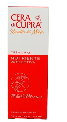 Crema de maini nutritiva, 75ml, Cera di CupraCera di Cupra – crema de maini cu actiune protectiva. Un tratament eficient de frumusete, special conceput pentru ingrijirea mainilor. Crema de maini Cupra Ceara combina proprietatile de protectie a cearei de albine si actiunea emolienta a glicerinei.Protejeaza mainile si lasa pielea neteda si catifelata. Efectul este de durata, pielea mentinandu-se hidratata mai multe ore.Mod de utilizare: aplicati crema de mai multe ori pe zi, pe mainile uscate, curate, si masati cu miscari circulare mari, pana la absorbtia completa.Prezentare: 75ml