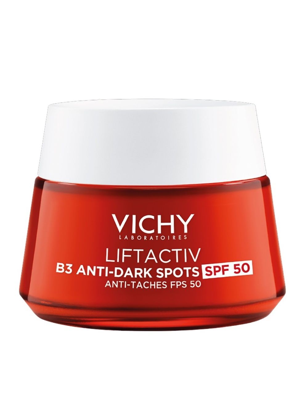 Crema de zi antirid B3 Liftactiv Specialist SPF50, 50ml, Vichy Noua Cremă B3 anti-pete pigmentare brune spf50 are eficacitate avansată anti-îmbătrânire oferită de Niacinamidă(Vitamina B3) și de un ingredient activ cu efect exfoliant, combinată cu SPF50 cu spectru larg pentru a corecta și preveni apariția petelor pigmentare și a ridurilor. Hidratează intens, redă tonicitatea tenului și protejează pielea de radiațiile UV. Zi după zi, reduce vizibil ridurile și petele pigmentare, conferind pielii un aspect mai ferm și luminos. Combinație puternică de ingrediente active special selectate pentru o eficacitate optimă: Niacinamidă [B3] pentru a reduce vizibil aspectul petelor pigmentare Protecție cu spectru larg [SPF50] pentru a preveni melanogeneza prin blocarea stimulării UVA și UVB a pielii Ingrediente: Aqua/water – glycerin – ethylhexyl salicylate – ethylhexyl triazone – alcohol denat. – bis-ethylhexyloxyphenol methoxyphenyl triazine – dimethicone – lauroyl lysine – butyl methoxydibenzoylmethane – octyldodecanol – behenyl alcohol – isopropyl isostearate – perlite – aluminum starch octenylsuccinate – cetyl alcohol – hydrolyzed rice protein – adenosine – capryloyl salicylic acid – disodium edta – hydroxyacetophenone – palmitoyl tetrapeptide-7 – palmitoyl tripeptide-1 – sodium acetylated hyaluronate – sodium hyaluronate – niacinamide – tocopherol – acrylamide/sodium acryloyldimethyltaurate copolymer – ammonium polyacryloyldimethyl taurate – butylene glycol – carbomer – cetearyl alcohol – cetearyl glucoside – isohexadecane – myristic acid – palmitic acid – peg-100 stearate – pentylene glycol – poly c10-30 alkyl acrylate – polysorbate 20 – polysorbate 80 – sodium lactate – sodium polyacrylate starch – sodium stearoyl glutamate – sorbitan oleate – stearicacid – ci 15985/yellow 6 – ci 16035/red 40 – phenoxyethanol – parfum/fragrance Mod de utilizare: Aplicați zilnic dupa ser. Testat pe tenul sensibil sub control dermatologic. Precautii: Evitați zona ochilor. În caz de expunere intensă sau prelungită la soare, utilizați o protecție solară adaptată. Prezentare: 50ml