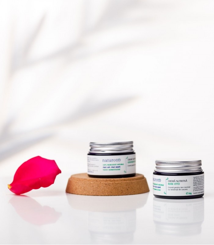 Crema nutritiva Rose Otto pentru ten uscat, 30g, Naturotto Formula pentru ten normal cu tendințe de uscare Rose Otto este vedeta gamei noastre. Cu o consistență fină și un parfum discret de trandafir, formula Rose Otto se absoarbe ușor în piele și hrănește și catifelează tenul. RECOMANDATĂ PENTRU TEN MATUR, TEN DESHIDRATAT SI TEN SENSIBIL BENEFICII: asigură o hrănire profundă a tenului și corectează deshidratarea protejează tenul de factorii externi nocivi – vânt, căldură, praf, umiditate, uscăciune, frig – care afectează îndeosebi tenul cu tendințe de uscare previne apariția ridurilor și altor semne de îmbătrânire regenerează pielea și îi oferă un aspect fin, catifelat, sănătos și strălucitor asigură o hrănire intensă a tenului prin formula concentrată, fără apă, din surse 100% naturale bogate în nutrienți INGREDIENTE: unt shea*, ulei orez, ulei măsline extravirgin*, ulei struguri (semințe), ulei argan*, ceară de albine, ulei essential de trandafir Rose Otto (Rose of Bulgaria) *certificat organic. Uleiul de măsline, bogat în vitamina E, recomandat pentru tratamentul intens al pielii uscate și deshidratate este combinat cu untul de shea și uleiul de orez care netezesc pielea, aduc tenului o strălucire sănătoasă și calmează iritațiile. Uleiul de argan are ca proprietate principală acțiunea anti-îmbătrânire. Uleiul esențial de trandafir hrănește intens pielea, este o sursă importantă de vitamina C, este regenerant, elasticizant și fermizant. Fiecare ingredient din formula produsului are un rol activ benefic. Prin procesul de manufacturare folosit sunt păstrate toate proprietățile ingredientelor, nefiind procesate termic. Prezentare: 30g