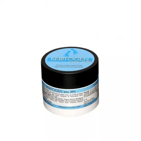 Crema pentru ingrijirea tegumentelor ingrosate Keritogen 30% uree, 50g, Herbagen Macereaza si hidrateaza straturile cornoase (calozitati) ale epidermei ce pot apare sub forma de: tegumente ingrosate in zona calcaielor, talpilor, palmelor, coatelor, bataturi (clavus), tesut ingrosat in jurul unghiilor. Mod de utilizare: Se aplica in fiecare seara dupa baie timp de trei zile consecutive, acolo unde exista calozitati. Se lasa sa actioneze pana a doua zi. Crema macereaza straturile cornoase, care pot fi indepartate prin frecare cu o pila pentru calcaie sau o piatra spongioasa. Pentru mentinerea aspectului neted al epidermei este recomandata folosirea cremei emoliente si reparatoare Keritogen. Prezentare: 50ml