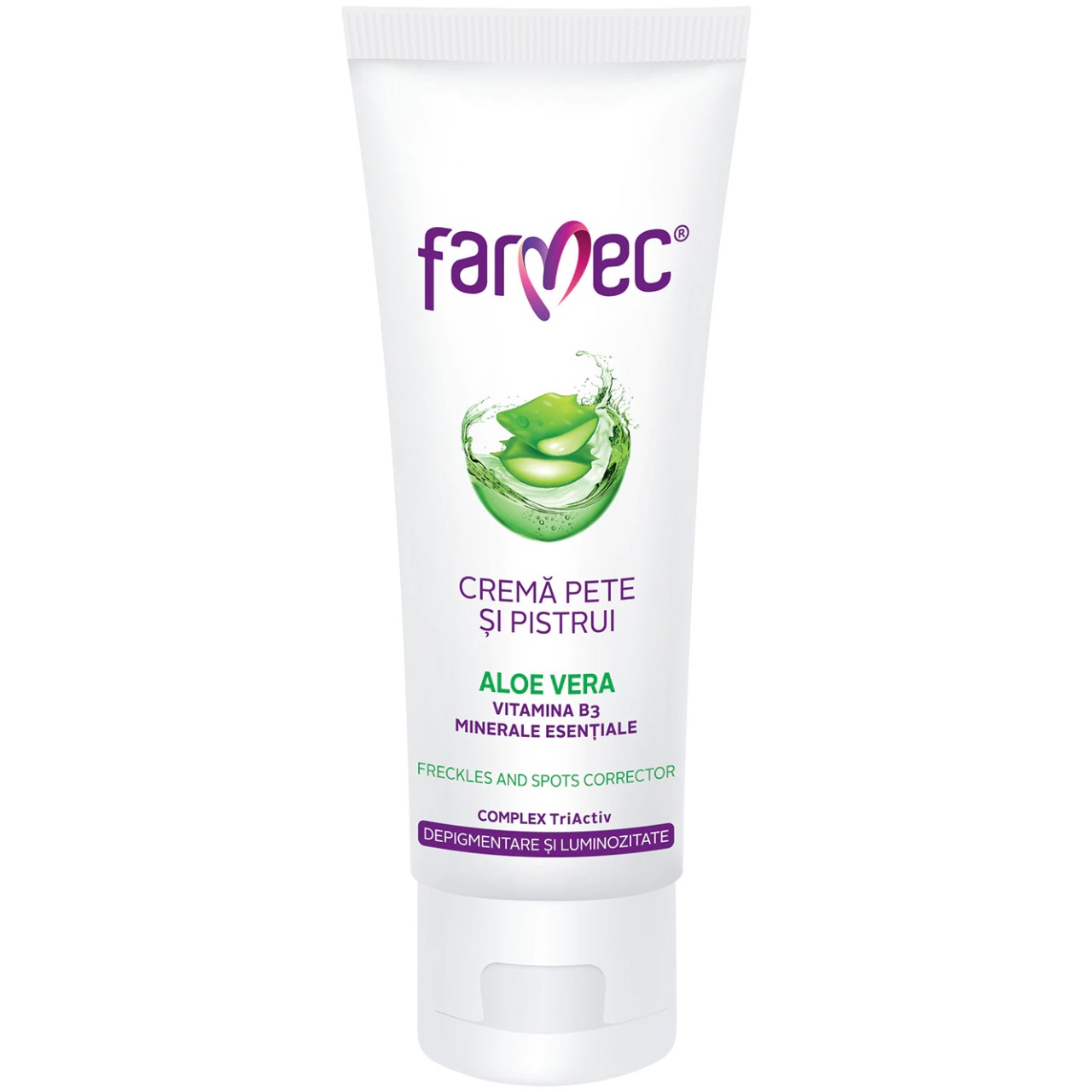 Crema pentru pete si pistrui cu Aloe Vera, 50ml, 6180, Farmec Tratamentul cu crema pentru pete şi pistrui are efect de decolorare şi atenuare a pistruilor şi a petelor de pigmentaţie, dar şi de prevenire a apariţiei acestora. Pistruii sunt mici pete circulare, mai pigmentate decât pielea din jur. În general, apar la persoanele cu pielea deschisă la culoare. Deşi nu reprezintă un pericol pentru sănătate, pistruii pot fi deranjanţi din punct de vedere estetic. Pielea capătă diferite imperfecțiuni, din cauze multiple: pistrui, pete pigmentare în urma expunerii la soare, urme de coșuri, pete de bătrânețe etc. Ingrediente active Crema a fost special concepută pentru îmbunătățirea aspectului pielii, prin ingredienții prezenți în formulare: AHA , acizii din fructe, au acțiune de peeling la suprafața pielii, decolorând astfel petele existente; Ferulanul prelungește în timp efectul de decolorare și previne apariția petelor noi prin neutralizarea radicalilor liberi generaţi de expunerea la radiaţiile ultraviolete; Uleiul de soia emoliază și hrănește epiderma, reface filmul protector superficial al pielii; Aloe Vera , prin efectul calmant, limitează iritarea excesivă a pielii. Mod de utilizare: Crema se aplică seara, pe pielea curată/demachiată, pe zonele afectate de pete și pistrui, evitând cu stricteţe regiunea ochilor, zonele care prezintă răni superficiale, negii. Se poate aplica și pe corp pe zonele cu pete pigmentare. Pentru rezultate vizibile, aplicarea cremei se face în cure de minim 6 săptămâni. Se întrerupe imediat folosirea cremei la cel mai mic semn de iritaţie şi înroşire locală, aplicându-se un produs cu acţiune calmantă. Aplicarea se reia după 2-3 zile, după dispariţia semnelor de iritaţie. ATENȚIONĂRI: Se recomandă ca folosirea cremelor cu efect de peeling să se efectueze toamna sau primăvara, pentru a feri pielea sensibilizată de stresul radiaţiilor solare şi de frig. Pe toată durata folosirii cremei se recomandă evitarea expunerii pielii la soare şi utilizarea zilnică a unui produs cu filtru de protecţie solară, cu FPS minim 20. Nu se va utiliza crema contra petelor după baia de abur sau orice tratament cosmetic care sensibilizează pielea. Prezentare: 50 ml
