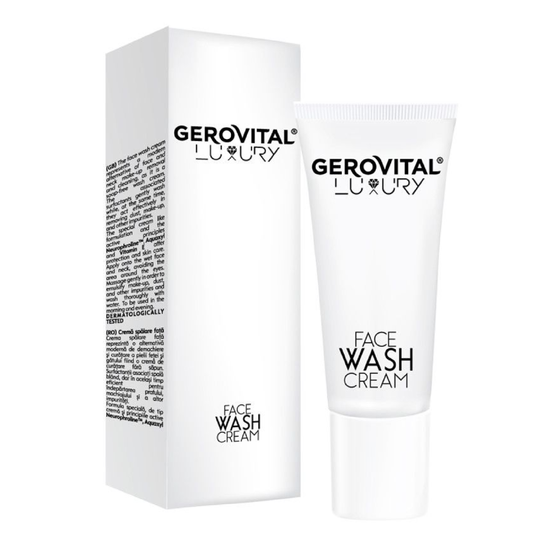 Gerovital Luxury Crema spalare Fata reprezinta o alternativa moderna de demachiere si curatare a pielii fetei si gatului fiind o crema de curatare fara sapun.Surfactantii asociati spala bland, dar in acelasi timp eficient pentru indepartarea prafului, machiajului si a altor impuritati.