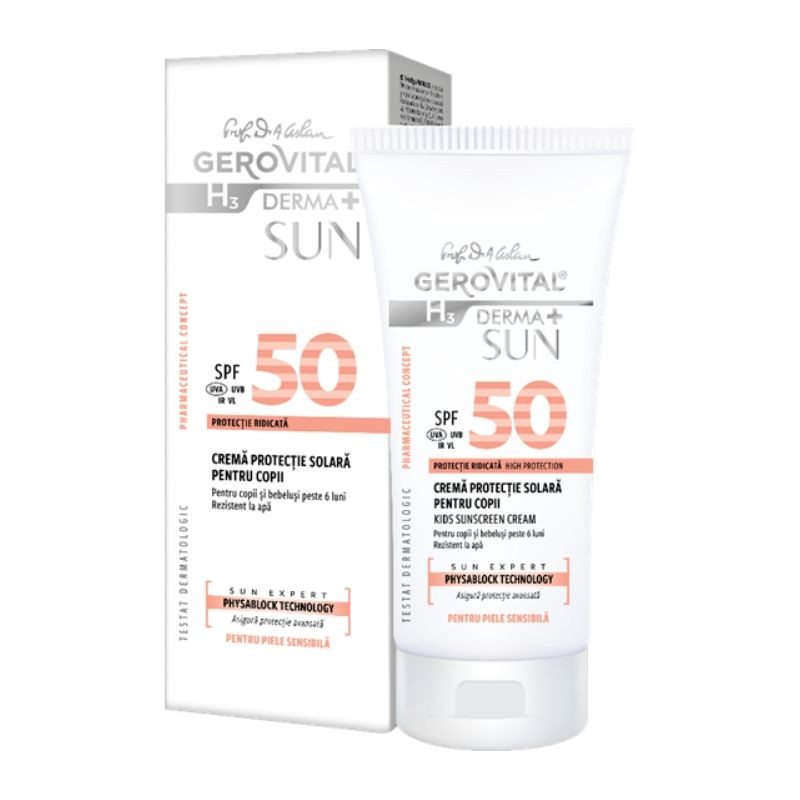 Crema protectie solara pentru copii SPF 50 H3 Derma+ Sun, 100 ml, Gerovital, ideala pentru aplicare zilnicaIn doza optima, expunerea la soare stimuleaza sinteza vitaminei D, benefica celor mici. Insa, o expunere prelungita sau in afara orelor recomandate duce la aparitia arsurilor solare. Daca aplici in mod regulat crema protectie solara pentru copii SPF 50 H3 Derma+ Sun, 100 ml, Gerovital, poti evita acest efect neplacut. Gerovital sun SPF 50 copii se remarca prin formula fara parfum si alcool, dar care este imbogatita cu vitamine si uleiuri.Cand este indicat sa aplici crema protectie solara pentru copii SPF 50 GerovitalGerovital protectie solara copii SPF 50 trebuie aplicata cu 15-30 de minute inainte de expunerea la soare. Iar pentru un nivel de protectie ridicat, reaplica frecvent produsul, mai ales dupa inot. De asemenea, crema protectie solara copii Gerovital trebuie folosita chiar si in zilele in care este innorat. Asadar, redu riscurile deteriorarii pielii si comanda online la pret avantajos crema protectie solara pentru copii SPF 50 H3 Derma+ Sun, 100 ml, Gerovital.