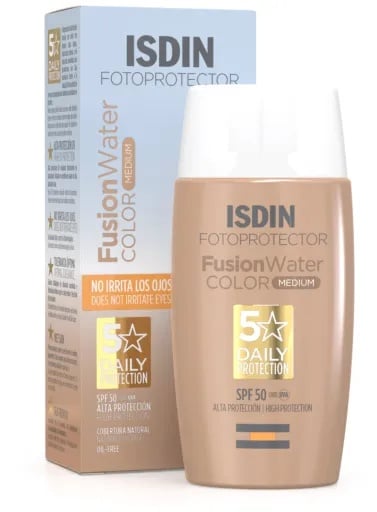 Crema protectie solara pentru fata SPF50 Fusion Water Color, 50ml, ISDIN Crema de protectie solara colorata cu faza apoasa si textura ultra-lejera, pentru hidratare intensa si absorbtie imediata, care garanteaza o protectie ridicata impotriva radiatiilor UV, ca sa va puteti bucura de soare pe parcursul activitatilor in aer liber. Acoperire cu efect natural. potrivita pentru toate tipurile de piele, chiar si pentru pielea atopica. Non-comedogenica. Textura ultra-lejera cu absorbtie imediata si nivel ridicat de hidratare, care nu lasa urme. Formula cu majoritatea ingredientelor biodegradabile si anorganice. Ingrediente: Aqua (Water), Octocrylene, Propanediol, Butyl Methoxydibenzoylmethane, Ethylhexyl Salicylate, Polymethyl Methacrylate, CI 77891 (Titanium Dioxide), Phenylbenzimidazole Sulfonic Acid, Polysilicone-15, Caprylic/Capric Triglyceride, Hydrogenated Polydecene, Propylene Glycol Dicaprylate/Dicaprate, Tromethamine, Bis-Ethylhexyloxyphenol Methoxyphenyl Triazine, Silica, CI 77492 (Iron Oxides), 1,2-Hexanediol, Hydroxyacetophenone, Magnesium Aluminum Silicate, Polysorbate 60, Disteardimonium Hectorite, Caprylyl Glycol, Tocopheryl Acetate, Xanthan Gum, CI 77491 (Iron Oxides), Propylene Carbonate, CI 77499 (Iron Oxides), Disodium EDTA, Parfum (Fragrance), Aluminum Hydroxide, PEG-8, Sodium Lauroyl Glutamate, Lysine, Tocopherol, Magnesium Chloride, Ascorbyl Palmitate, Ascorbic Acid, Citric Acid. Mod de utilizare: Aplicati din abundenta pe pielea uscata sau uda, cu treizeci de minute inainte de expunerea la soare. Apoi aplicati din nou la fiecare 2 ore si dupa ce transpirati, dupa inot sau uscare cu prosopul. Precautii: Daca se aplica o cantitate mai mica, factorul de protectie este mai mic. Nu expuneti bebelusii si copiii la lumina directa a soarelui. A nu se lasa produsul la indemana copiilor. Prezentare: 50ml