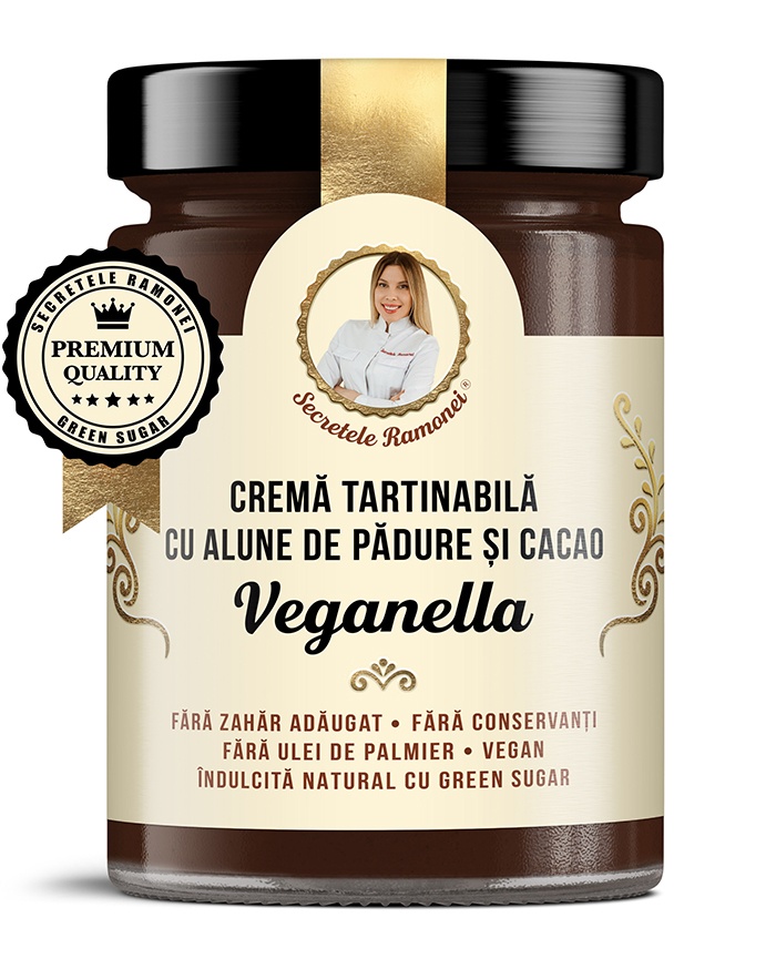 Crema tartinabila alune si cacao Veganella, Secretele Ramonei, 350g, Remedia VEGAN – FARA ZAHAR ADAUGAT – FARA CONSERVANTI – FARA ULEI DE PALMIER – INDULCIT NATURAL CU GREEN SUGAR INGREDIENTE: Alune de padure (22%), faina de orez, Green Sugar*, ulei de arahide, cacao degresata (9%), unt de sal, lecitina din floarea soarelui, arome naturale, extract de rozmarin. ALERGENI: Alune de padure, arahide. *Green Sugar este un indulcitor 100% natural, cu ZERO calorii si ZERO indice glicemic, un amestec din extract de inalta puritate din frunze de Stevia Rebaudiana si Eritritol. Produsul nu contine ingrediente sau aditivi OMG. Separarea uleiului este normala, semn ca produsul nu este ajutat de E-uri. Pur si simplu amestecati-l la loc si savurati. Mod de utilizare: Dupa preferinta, direct din borcan, in combinatie cu fructe proaspete, pe paine integrala, clatite, topping in porridge sau in prajituri dietetice. Atentionari: A nu se utiliza dupa data de expirare inscrisa pe ambalaj. A se depozita la temperaturi sub 25ºC, in ambalajul original, ferit de umiditate si lumina. Dupa deschidere se poate pastra la temperatura camerei si a se consuma in 30 de zile. Nu este recomandat persoanelor alergice la oricare din ingredientele produsului. Poate contine urme de: soia sau diverse tipuri de nuci. Consumul excesiv poate avea efect laxativ. Prezentare: borcan 350g