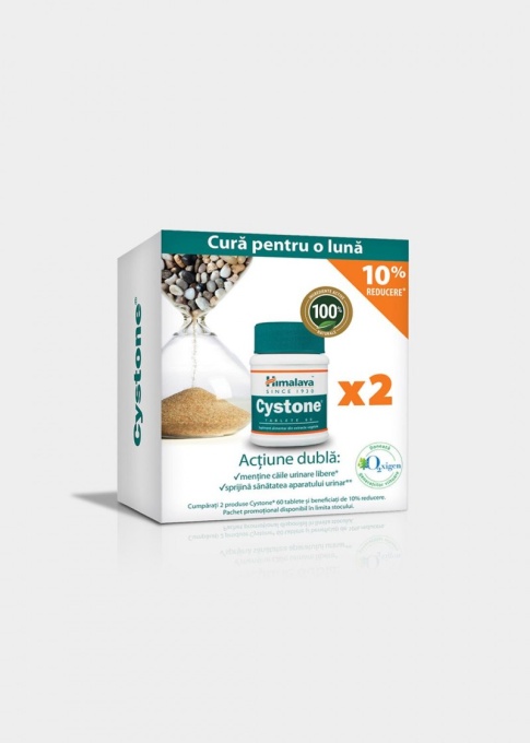 Cystone este un supliment alimentar cu efect benefic asupra stării de sănătate prin diminuarea urinărilor frecvente, menținerea unui nivel optim al lichidului prin tractul urinar și asigurarea condițiilor de diminuare a riscului apariției infecțiilor urinare. – efect benefic în litiaza urinară, cristalurie, împiedicarea formării postoperatorii a calculilor, incontinență urinară, disurie; – contribuie la reducerea stărilor inflamatorii și a distrugerii și eliminării calculilor renali; – înlătură disconfortul și atenuează simptomele dureroase datorate acestor afecțiuni. Ingrediente Didymocarpus pedicellata, Saxifraga ligulată, Rubia cordifolia, Cyperus scariosus, Achyranthes aspera, Onosma bracteatum, Vernonia cinerea, Hajrul yahood bhasma (oxid natural de calciu), Shilajeet purificat (rășina minerală). Mod de administrare: Numai pentru adulți – câte 2 tablete de 2 ori pe zi. Prezentare: 60 tablete +60 tablete pachet promotional