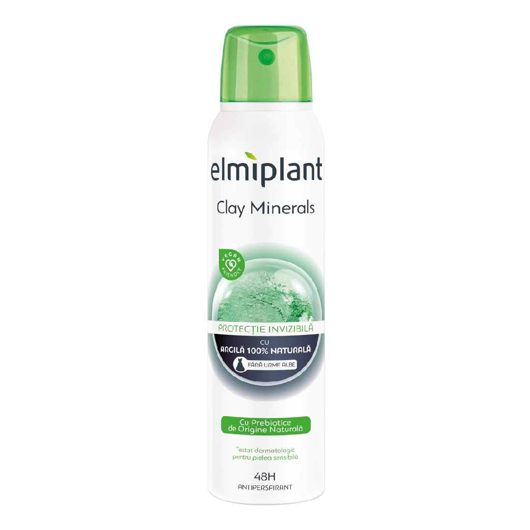 Cu Argila 100% Naturala, protectie timp de 48 de ore, prebiotice de origine naturala si formula impotriva petelor albe, deodorantul antiperspirant spray Elmiplant Clay Minerals ofera protectie invizibila si un parfum fresh fructat, dublat de o nota de baza de vanilie.