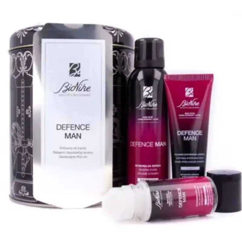 Deodorant roll-on 50ml, + Spuma de barbierit anti-iritatii 200ml + Balsam aftershave 75 ml, Defence Man DryTouch, BioNike Deodorant roll-on Defence Man DryTouch, 50ml, BioNike Deodorant fara alcool si fara parfum, potrivit pentru pielea sensibila si intoleranta. Inhiba formarea mirosurilor neplacute, dar nu afecteaza procesul normal de transpiratie al pielii. Asigura o dezodorizare eficienta si ofera o senzatie de prospetime pe tot parcursul zilei. Mod de utilizare: Aplicati in zona axilei, imediat dupa ce ati curatat si uscat. Lista INCI: Apa, propilen glicol, pentilen glicol, clorohidrat de aluminiu, butilen glicol, ceteareth-2, alcool miristilic, citronelil metilcrotonat, ceteareth-3, ceteareth-20, ceteareth-30, ceteareth-25, alantoina, tocoferil acetat, pantenol, extract de Lonicera Japonica. Prezentare: 50 ml Spuma de barbierit anti-iritatii Defence Man, 200ml, BioNike Spuma moale, delicata, pentru piele sensibila si intoleranta. Permite un barbierit rapid si usor, respectand in acelasi timp pielea. Formula imbogatita cu ingrediente active de inmuiere si revigorare impiedica iritarea si roseata, lasand pielea fetei catifelata si hidratata. Recomandata pentru ras, inclusiv zilnic. Mod de utilizare: Se agita bine inainte de utilizare, se distribuie o cantitate de produs in zona dorita, dupa ce a fost umezita. Ingrediente: Apa, trietanolamina, acid stearic, acid palmitic, glicerina, ceteareth-20, butan, propilen glicol, acid de cocos, propan, PEG/PPG-18/18 dimeticona, ulei de migdale dulci, triglyceride caprilica/caprica, izobutan, pentilen glicol, tocoferil acetat, alantoina, mentol, ulei de menta, lauroil sarcozinat de sodiu, poliquaterniu-7, EDTA disodica, parfum (non-alergic). Prezentare : 200ml Balsam aftershave Defence Man, 75ml, BioNike Fara Conservanti – Fara Gluten – Fara Alcool – Testat pentru Nichel Cu o textură ușoara si absorbtie rapida, ofera un confort ridicat al pielii. Formula fara alcool, imbogatita cu ingrediente de calmare, reparare ce promoveaza funcția de barieră naturală a pielii. Ideal pentru a satisface nevoile pielii bărbaților pentru a hidrata și proteja după bărbierit. Include un parfum non-alergic. Mod de utilizare: Aplicati dupa barbierit o cantitate mică de produs pe fata si gat, prin miscari usoare. Contine: Unt de shea: unt vegetal emolient și protector. De asemenea, combate roșeața și repara pielea. Glicerina si xilitolul: hidratante. Bisabolol: calmează pielea. Previne iritatia. Beta-Glucan: un polizaharid care susține mecanismele naturale de reparare a pielii, combătând efectele dure ale bărbieritului și întărirea pielii Prezentare : 75ml