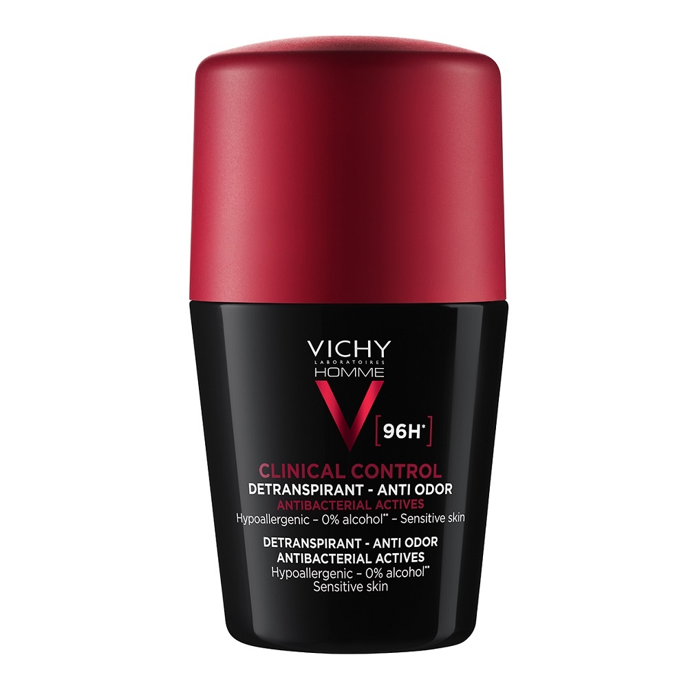 Deodorant roll-on 96h Clinical control fara alcool, 50ml, Vichy Homme Are o eficacitate de 96 de ore*. Formula contine zinc antibacterian cu rol de purificare si neutralizarea mirosurilor de la sursa. Este hipoalergenic, potrivit pentru pielea sensibila. *Efect de piele uscată și antitranspirant timp de 96 de ore. Ingrediente active: Zinc mineral – activ antibacterian, rol de purificare, eficacitate antibacteriana si anti miros chiar si in dozaj redus. Formează lanțuri nevolatile de sare cu acizii grași care există în mod natural pe piele, pentru a inhiba mirosul înainte ca acesta să înceapă să se simtă. Ingrediente: AQUA/WATER/EAU, ALUMINIUM CHLOROHYDRATE, DIMETHICONE, C14-22 ALCOHOLS, PARFUM/FRAGRANCE, STEARETH-100/PEG-136/HDI CPOPLYMER, PERLITE, ZINC PCA, C12-20 ALKYL GLUCOSIDE. Prezentare: 50ml