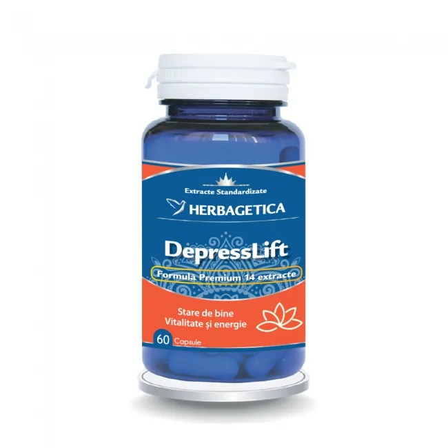 DepressLift, 60 capsule, Herbagetica DepressLift conține o formulă premium de 14 extracte care asigură creșterea nivelului de energie și vitalitate, reface echilibrul psiho-emoțional prin extractele de 5-HTP și L-Dopa naturală. Actiune: – Crește rezistența organismului la stres – Crește buna dispoziție, sentimentul de motivație și entuziasmul – Ofera energie și vitalitate organismului – Stimulează capacitățile psihice și mentale – Protejează creierul și sistemul nervos. Compoziție per 1 capsulă: Extract Mucuna pruriens 30% L-Dopa 80mg Extract 8:1 Ashwagandha 7 % Withanolizi și 1% Alcaloizi 80 mg Extract Griffonia simplicifolia 30 % L-5-HTP/ L-5-hidroxitriptofan 40 mg Extract 10:1 Tinospora cordifolia 2.5% principii amare 25 mg Extract Eclipta alba 0.5% Alcaloizi 25 mg Extract Coama-Leului 30% Polizaharide 25 mg Extract 15:1 Tulsi 2% Acid ursolic 25 mg Extract 4:1 Schisandra chinensis 25 mg Extract 6:1 Sunătoare 0,3% Hipericină 25 mg Extract 4:1 Nardostachys jatamansi 25 mg Extract Convolvulus pluricaulis 2,5% Taninuri 25 mg Extract Bacopa monnieri 50% Bacozide 20 mg Extract 8:1 Cardamon 15 mg Extract Piper longum 5% Piperină 15 mg Administrare cate 2-3 capsule pe zi Precauții/Contraindicații: A nu se consuma de către persoanele cu sensibilitate la oricare dintre ingredientele produsului. A nu se consuma de către copii, femeile însărcinate sau care alăptează. Prezentare : 60 capsule